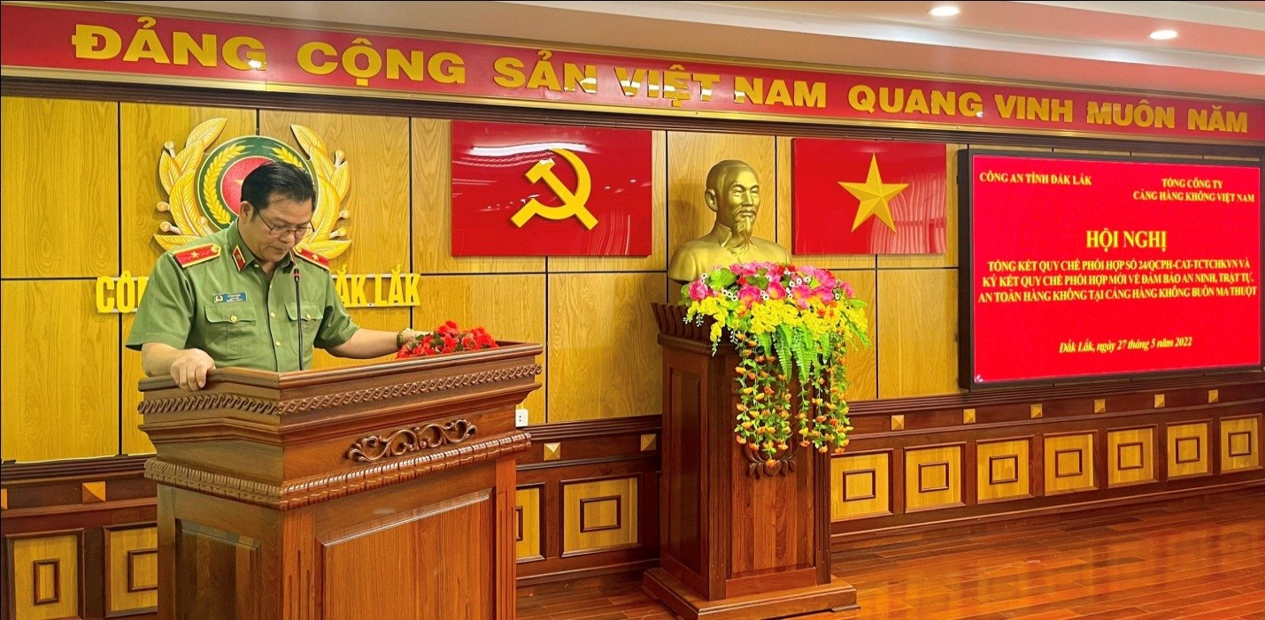 Chiều ngày 27/05/2022, tại Hội trường Công an tỉnh Đắk Lắk, Tổng công ty Cảng hàng không Việt Nam và Công an tỉnh Đắk Lắk tổ chức Hội nghị Tổng kết quy chế phối hợp số 24/QCPH-CAT-TCTCHKVN, ngày 01/2/2019 và ký kết quy chế phối hợp mới về bảo đảm an ninh, trật tự, an toàn hàng không tại Cảng hàng không Buôn Ma Thuột.