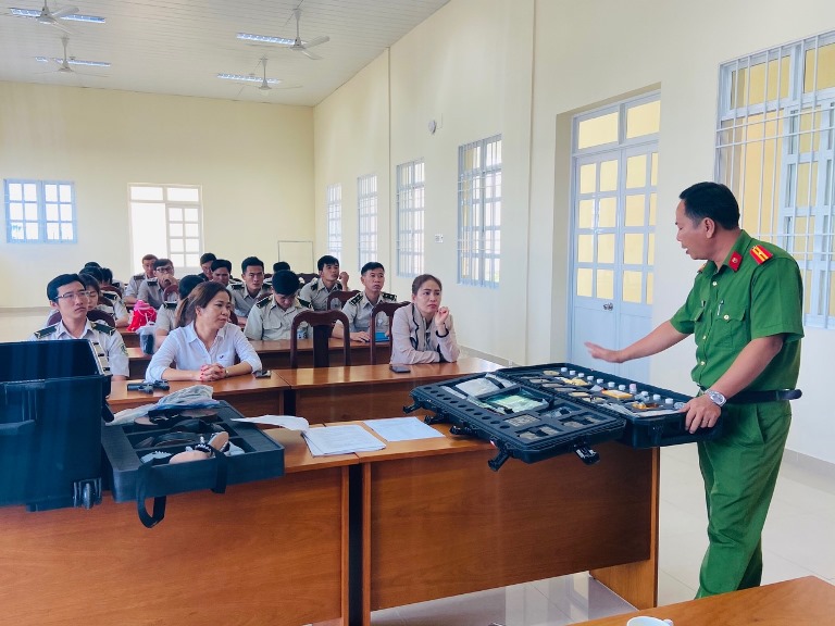 Song song đó, học viên nắm được nguyên tắc quản lý, sử dụng vũ khí, vật liệu nổ, tiền chất thuốc nổ và công cụ hỗ trợ; nhận dạng qua máy soi chiếu an ninh các loại thuốc nổ, phụ kiện nổ, vũ khí, công cụ hỗ trợ… cùng với việc thực hành sử dụng công cụ hỗ trợ; các thao tác tháo lắp, sử dụng, quy tắc và tư thế bắn súng ngắn RG88 kết hợp với thực hành bắn đạn thật.