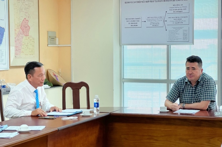 Ông Phạm Thanh Lâm - Giám đốc Cảng hàng không Cà Mau (bên trái) trao đổi với Ông Lê Khả Trường - Phó chủ tịch thường trực, Chủ nhiệm UBKT Công đoàn Tổng công ty