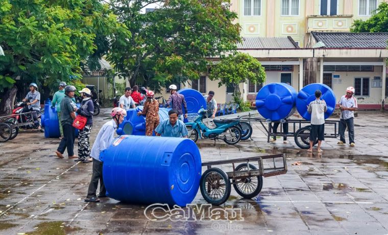 Người dân hợp sức vận chuyển bồn trữ nước về nhà.