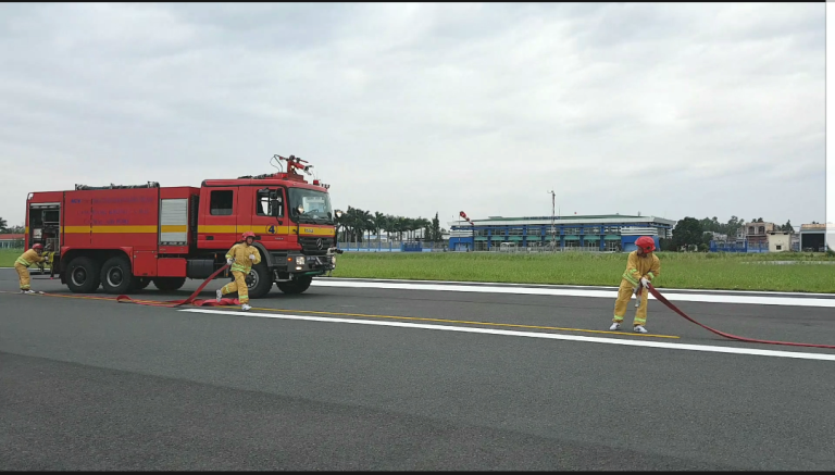 Thực hành chữa cháy tình huống giả định tàu bay gặp nạn ngoài đường cất hạ cánh.