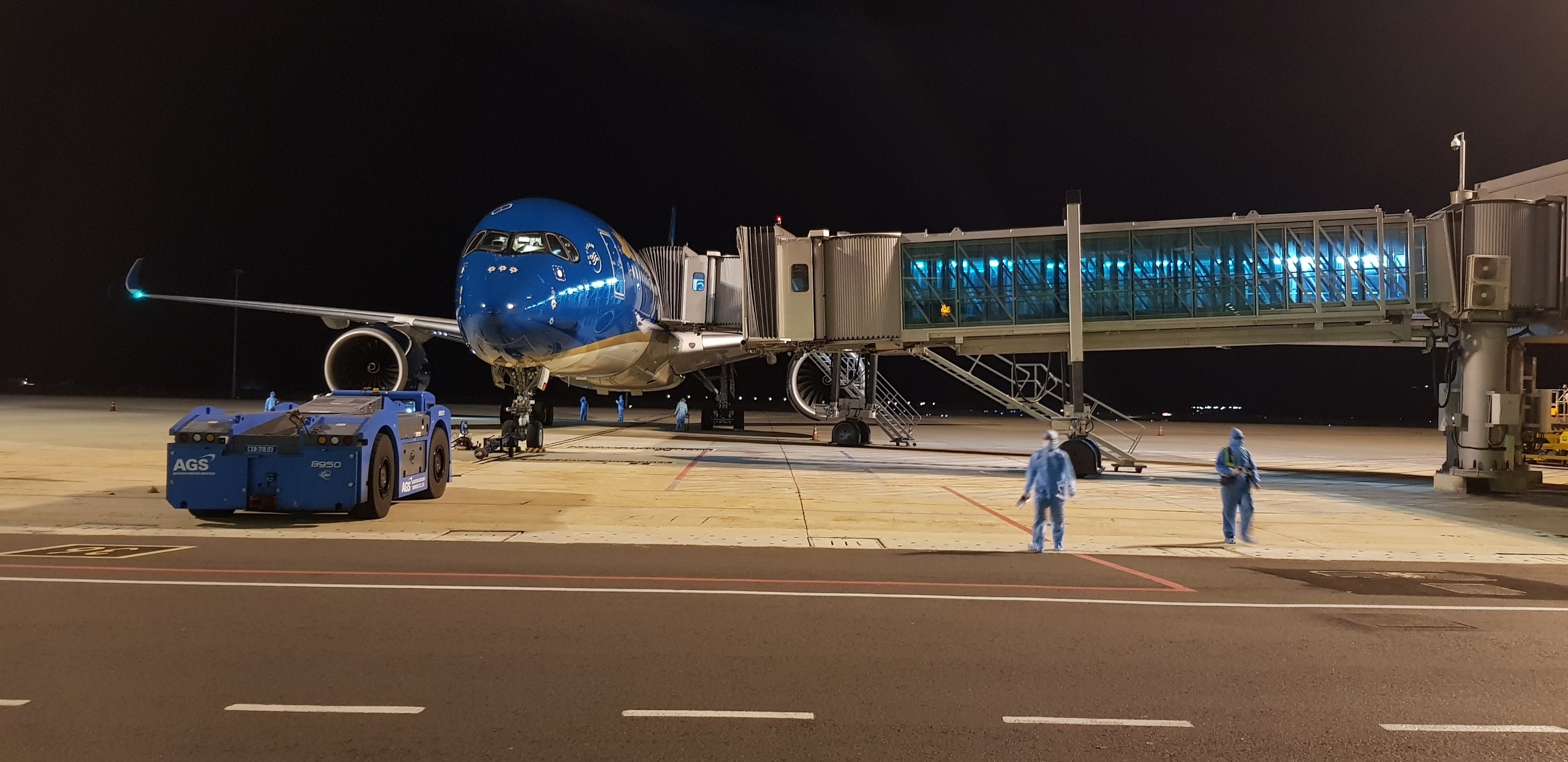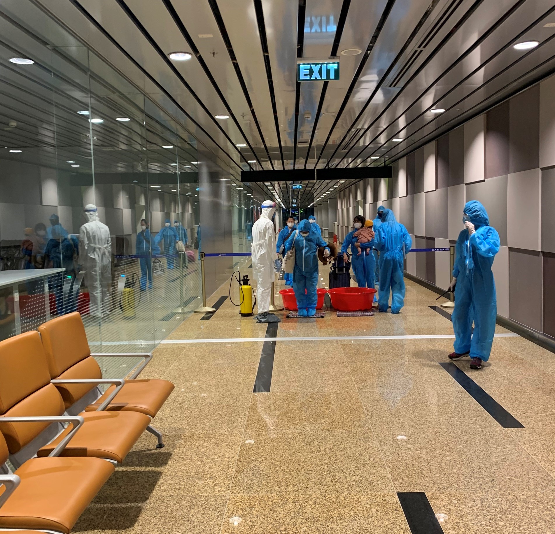 Sau khi hoàn tất khâu đón và bàn giao hành khách, toàn bộ khu vực làm thủ tục, luồng di chuyển của hành khách, các thiết bị kỹ thuật tại sân bay cũng như tàu bay được phun xịt khử trùng, đề phòng lây lan dịch bệnh.