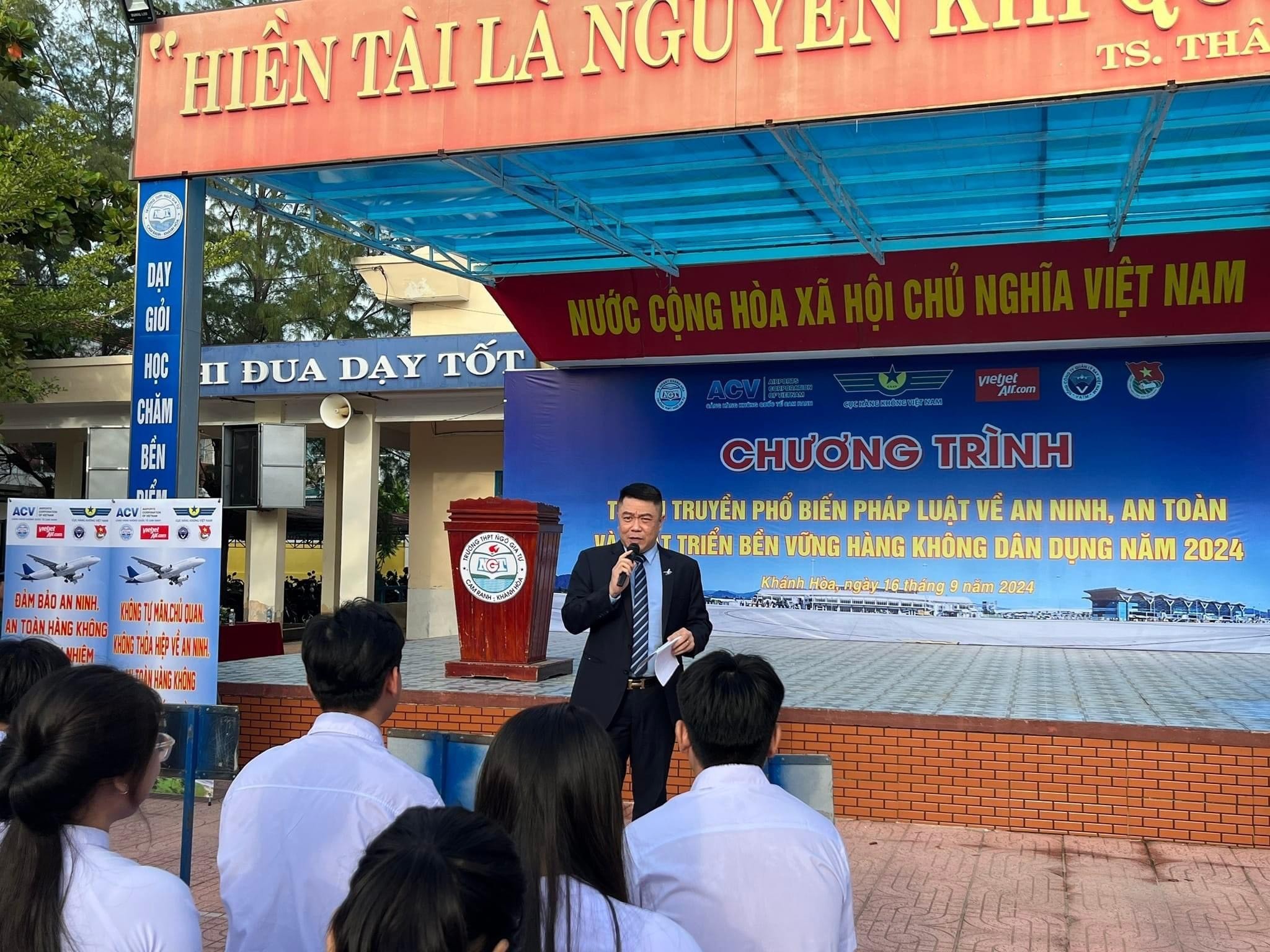 Sáng ngày 16/9/2024, tại trường THPT Ngô Gia Tự, phường Cam Nghĩa, thành phố Cam Ranh, Cảng HKQT Cam Ranh đã phối hợp với Cục hàng không Việt Nam tổ chức Chương trình Tuyên truyền văn hóa an ninh, an toàn hàng không năm 2024.