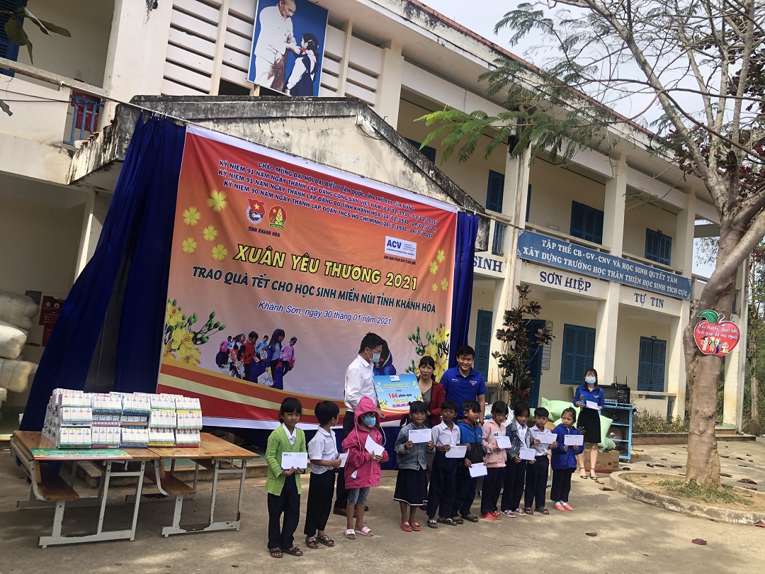 Trước đó, ngày 30/01/2021, cũng với chủ đề “Xuân yêu thương”, BCH Công đoàn – Đoàn TN Cảng HKQT Cam Ranh đã phối hợp của tỉnh Đoàn Khánh Hòa trao tặng 164 suất quà với tổng giá trị 32.800.000 đồng từ nguồn kinh phí được quyên góp từ cán bộ nhân viên đơn vị cho 164 cháu học sinh có hoàn cảnh khó khăn tại trường tiểu học Sơn Hiệp, huyện Khánh Sơn, tỉnh Khánh Hòa.