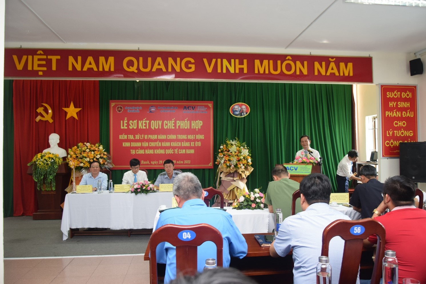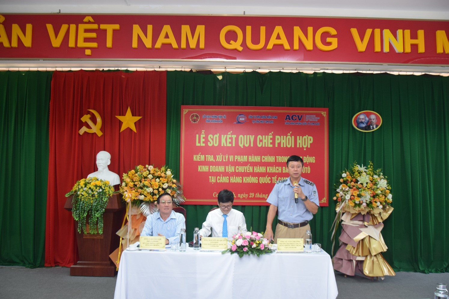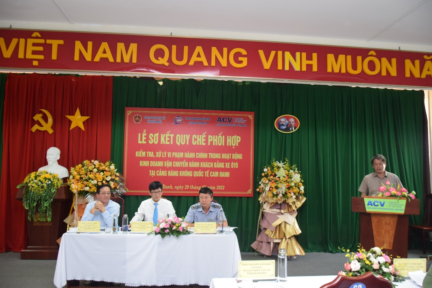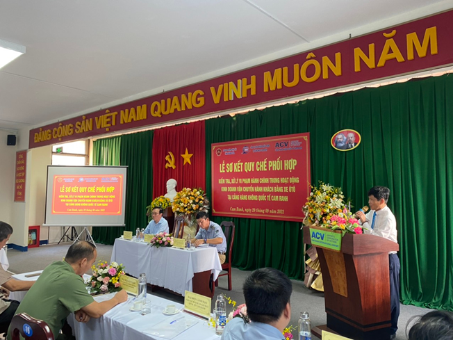 Chiều ngày 29/09/2022, tại Hội trường Văn phòng Cảng HKQT Cam Ranh đã tổ chức Hội nghị Sơ kết thực hiện Quy chế phối hợp giữa Sở GTVT Khánh Hòa, Cảng vụ HK miền Trung tại Cam Ranh và Cảng HKQT Cam Ranh về việc kiểm tra, xử lý vi phạm hành chính trong hoạt động kinh doanh vận chuyển hành khách bằng xe ô tô tại Cảng hàng HKQT Cam Ranh.