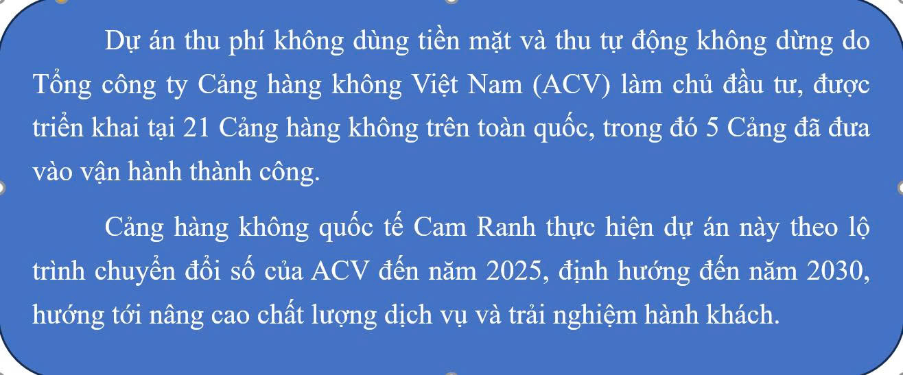 Việc đưa hệ thống thu phí tự động không dừng (ETC) vào hoạt động là một bước trong quá trình chuyển đổi số của Cảng hàng không quốc tế Cam Ranh, nhằm giảm ùn tắc giao thông, giảm phát thải CO₂, minh bạch hóa quy trình thu phí và tạo thuận tiện cho phương tiện ra vào sân bay.