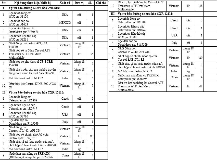 II. Nội dung chi tiết yêu cầu đối với vật tư bảo dưỡng 3 xe cứu hỏa trên: