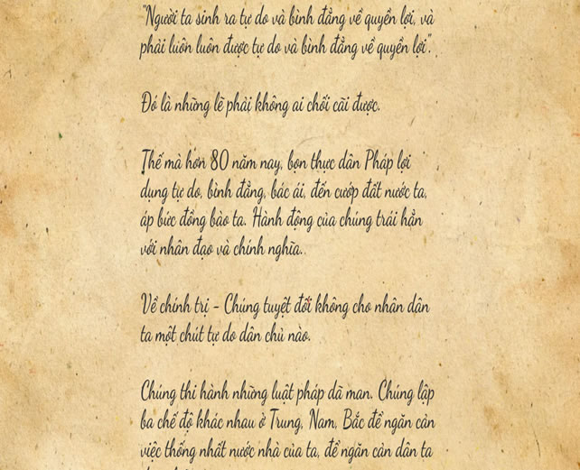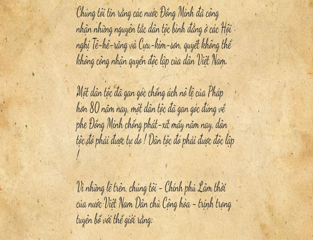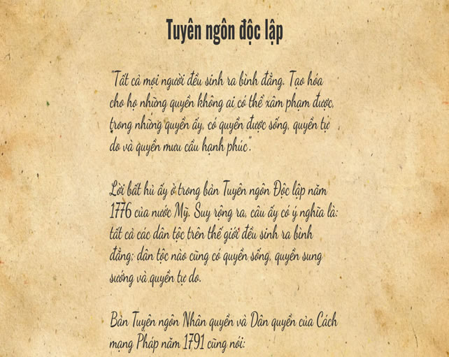 Tuyên ngôn Độc lập khẳng định quyền thiêng liêng, bất khả xâm phạm của nhân dân Việt Nam, chính thức tuyên bố trước thế giới sự ra đời của nước Việt Nam dân chủ cộng hòa, khẳng định quyền độc lập, tự do dân tộc, khẳng định ý chí sắt đá không gì lay chuyển nổi và đồng thời là triết lý nhân sinh vĩnh hằng của dân tộc Việt: “Không có gì quý hơn độc lập tự do”.