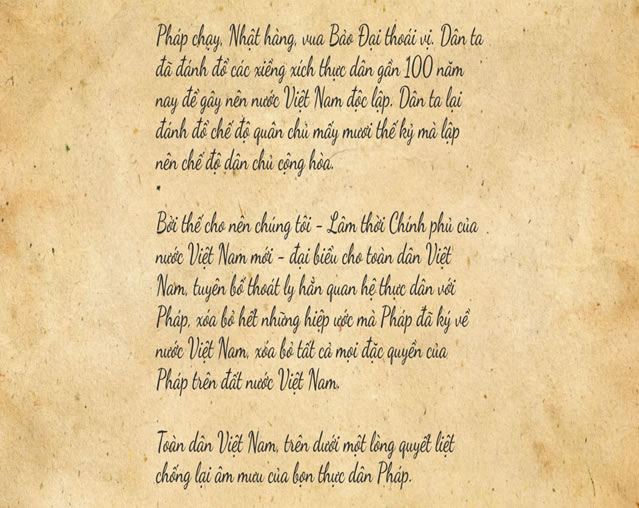 Tuyên ngôn Độc lập năm 1945 đánh dấu cột mốc trọng đại trong lịch sử dựng nước và giữ nước của dân tộc Việt Nam; chấm dứt ách thống trị của thế lực xâm lược thực dân, phát xít, song song đó cũng đánh dấu sự kết thúc chế độ phong kiến quân chủ ở Việt Nam.