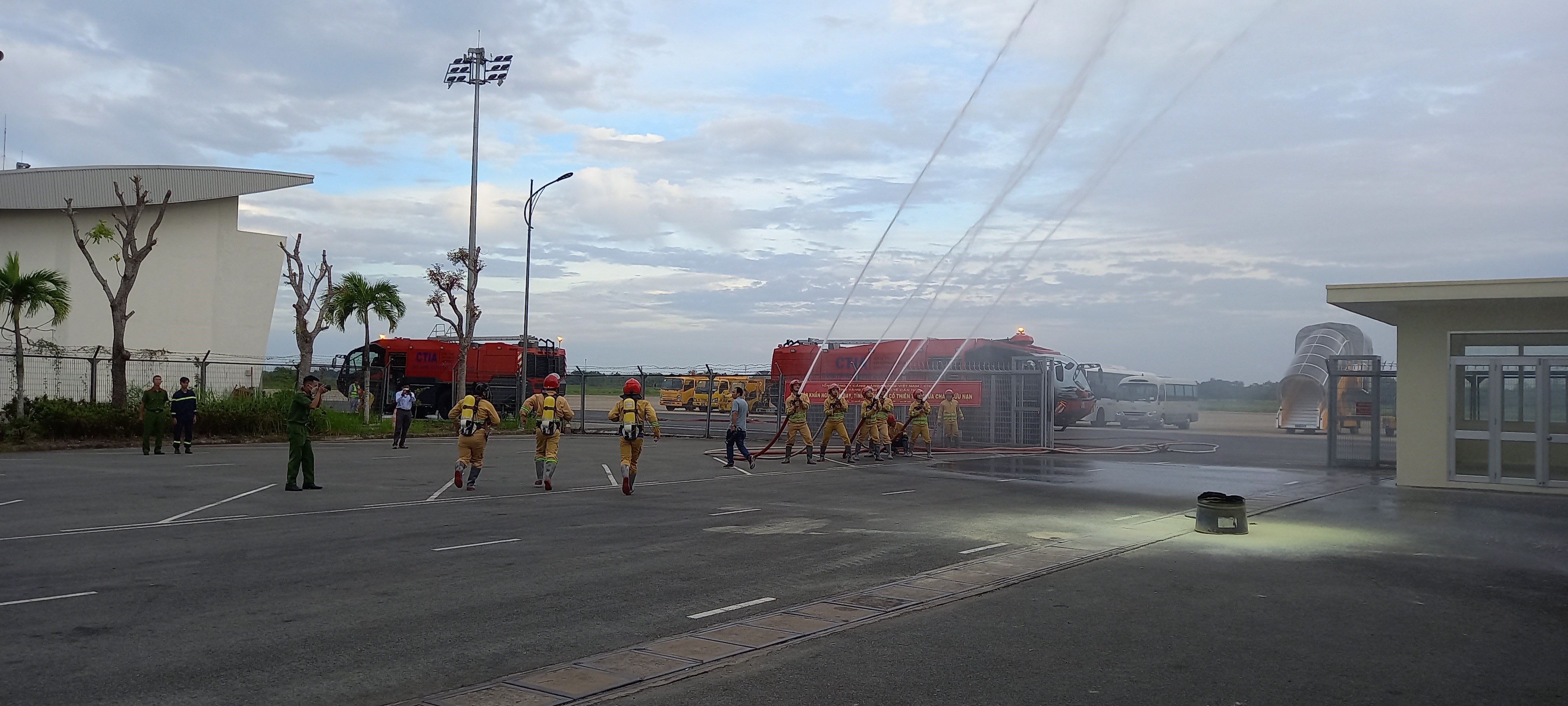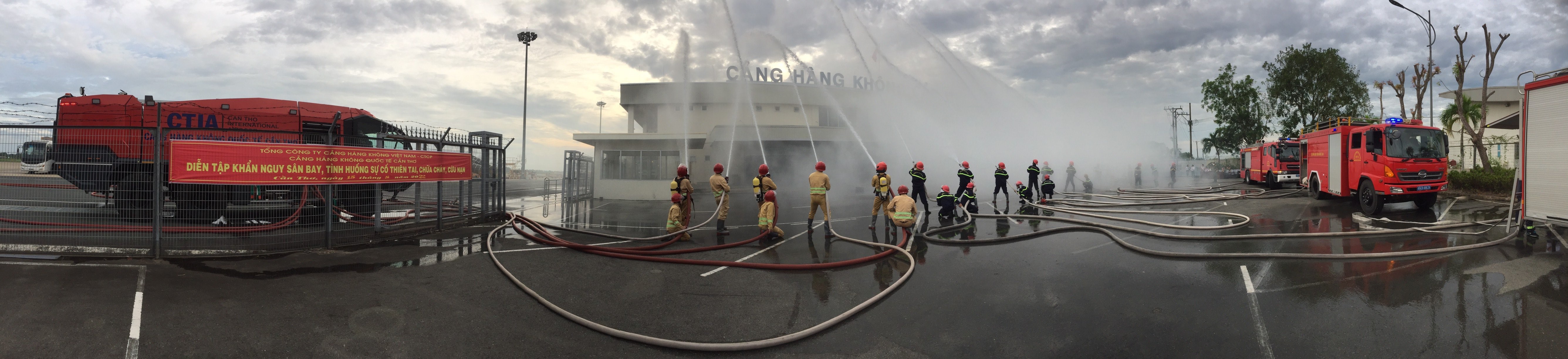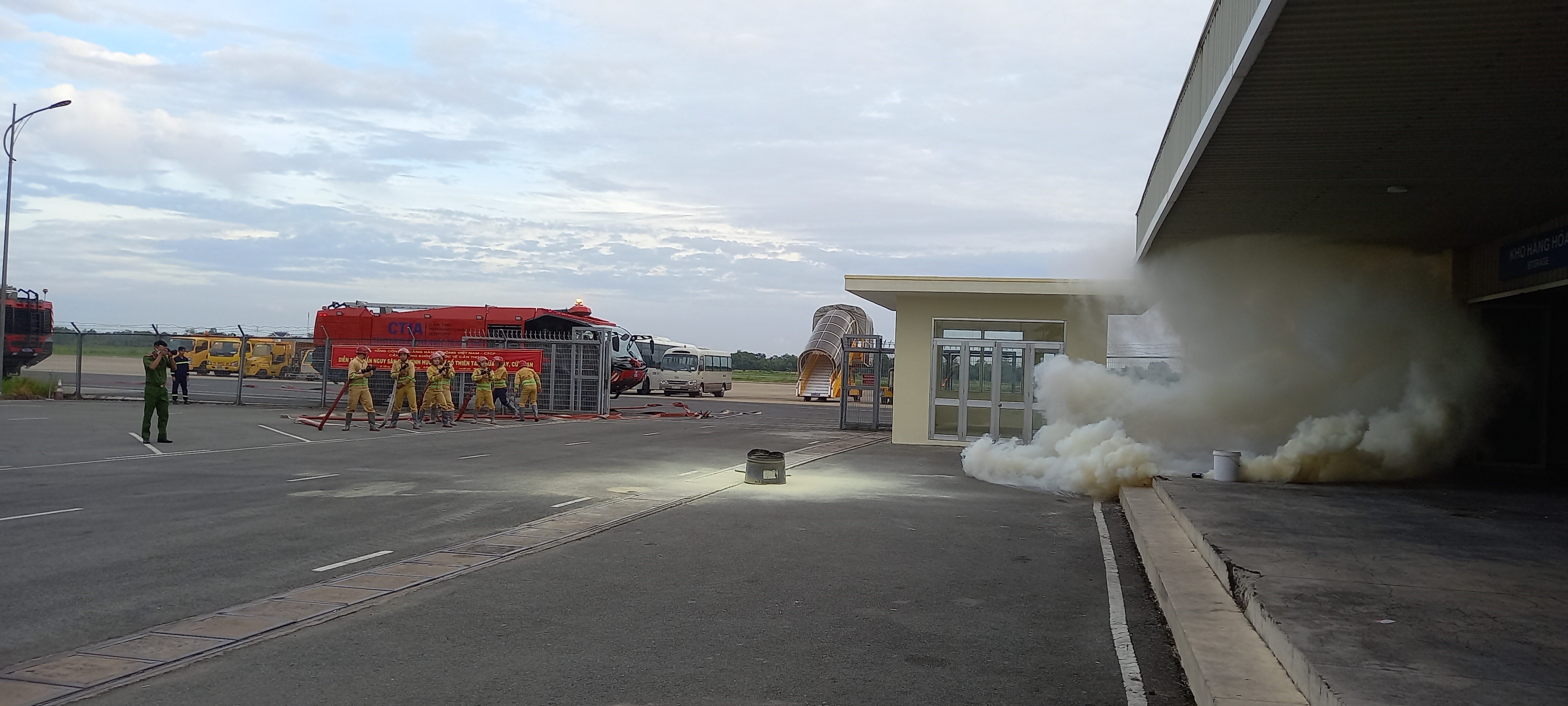 Cảng hàng không quốc tế Cần Thơ tổ chức diễn tập thực hành Phương án chữa cháy, cứu nạn, tình huống sự cố thiên tai với tình huống giả định “Do giông lốc lớn, tốc mái tôn, nước vào trần nhà văn phòng, làm chập điện gây cháy Nhà điều hành – ga hàng hóa”