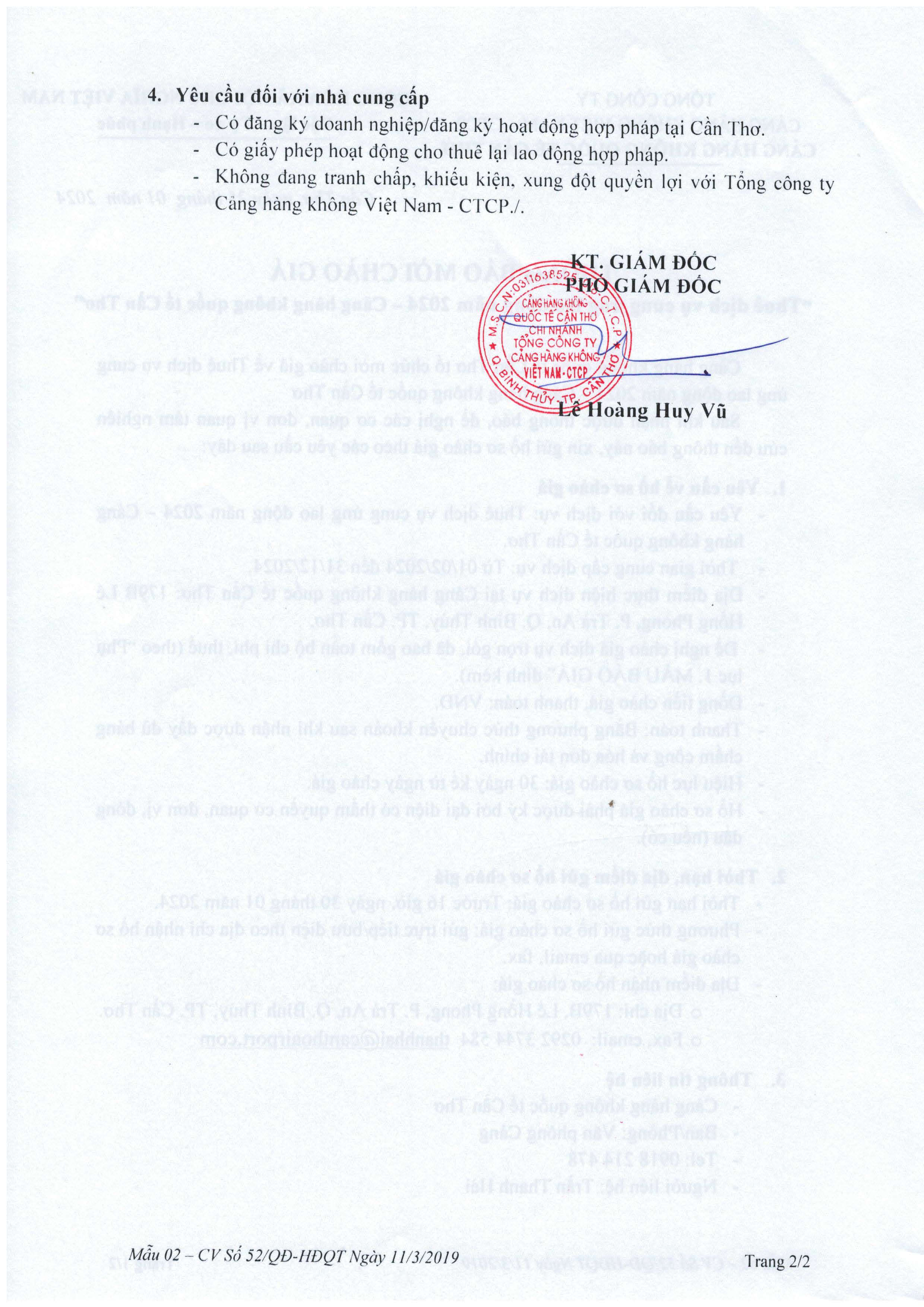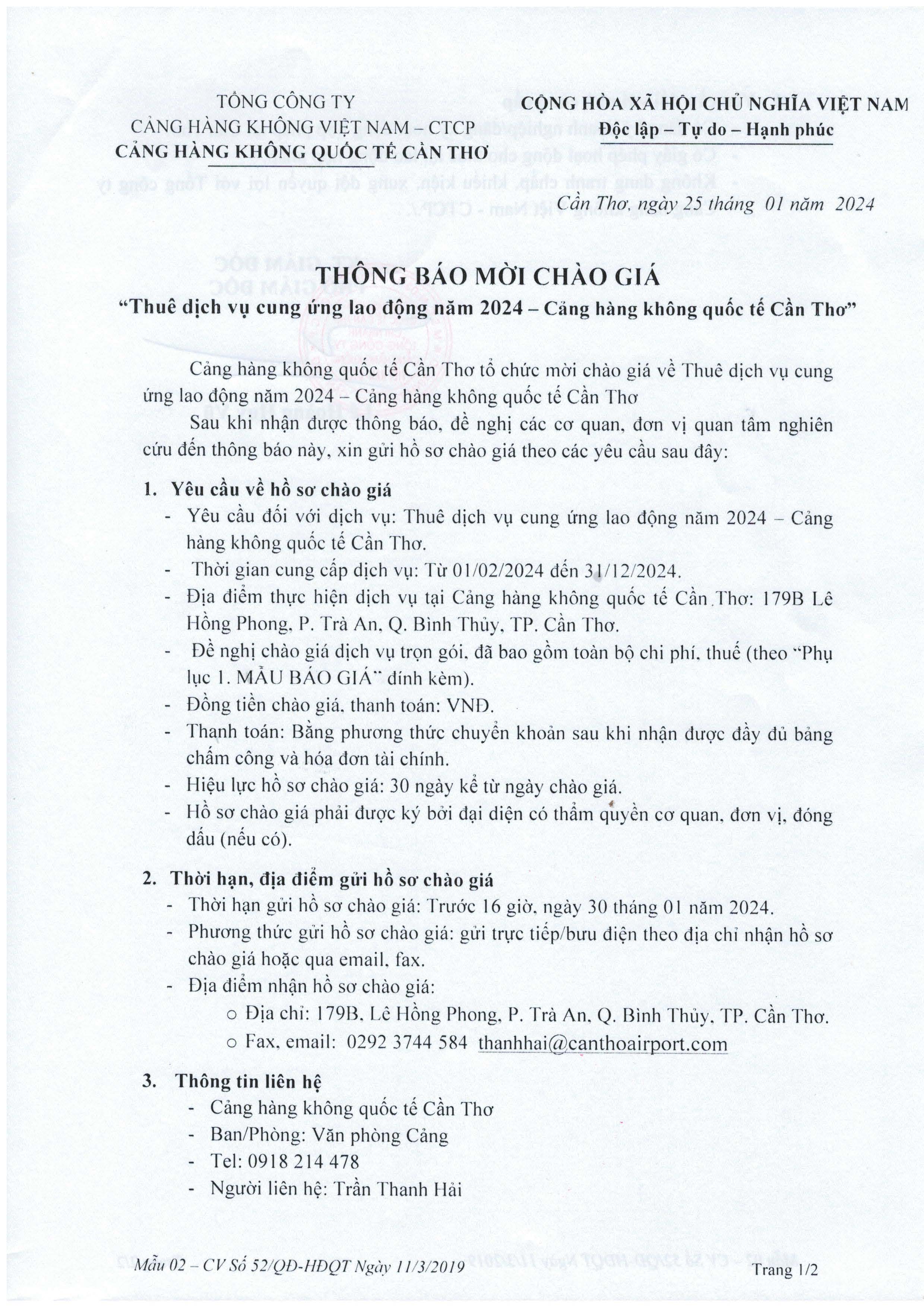 Cảng hàng không quốc tế Cần Thơ tổ chức mời chào giá về Thuê dịch vụ cung ứng lao động năm 2024 - Cảng hàng không quốc tế Cần Thơ.