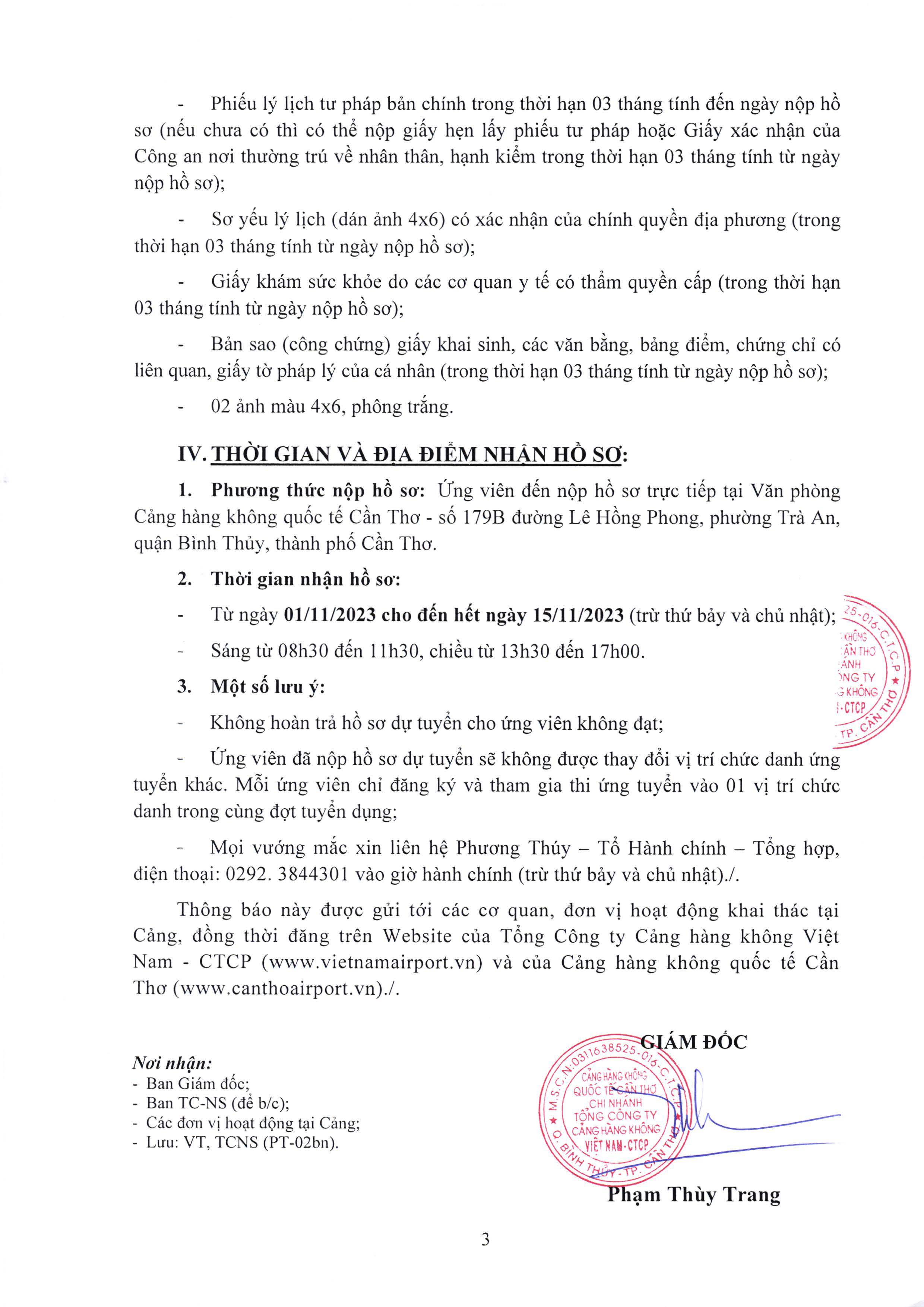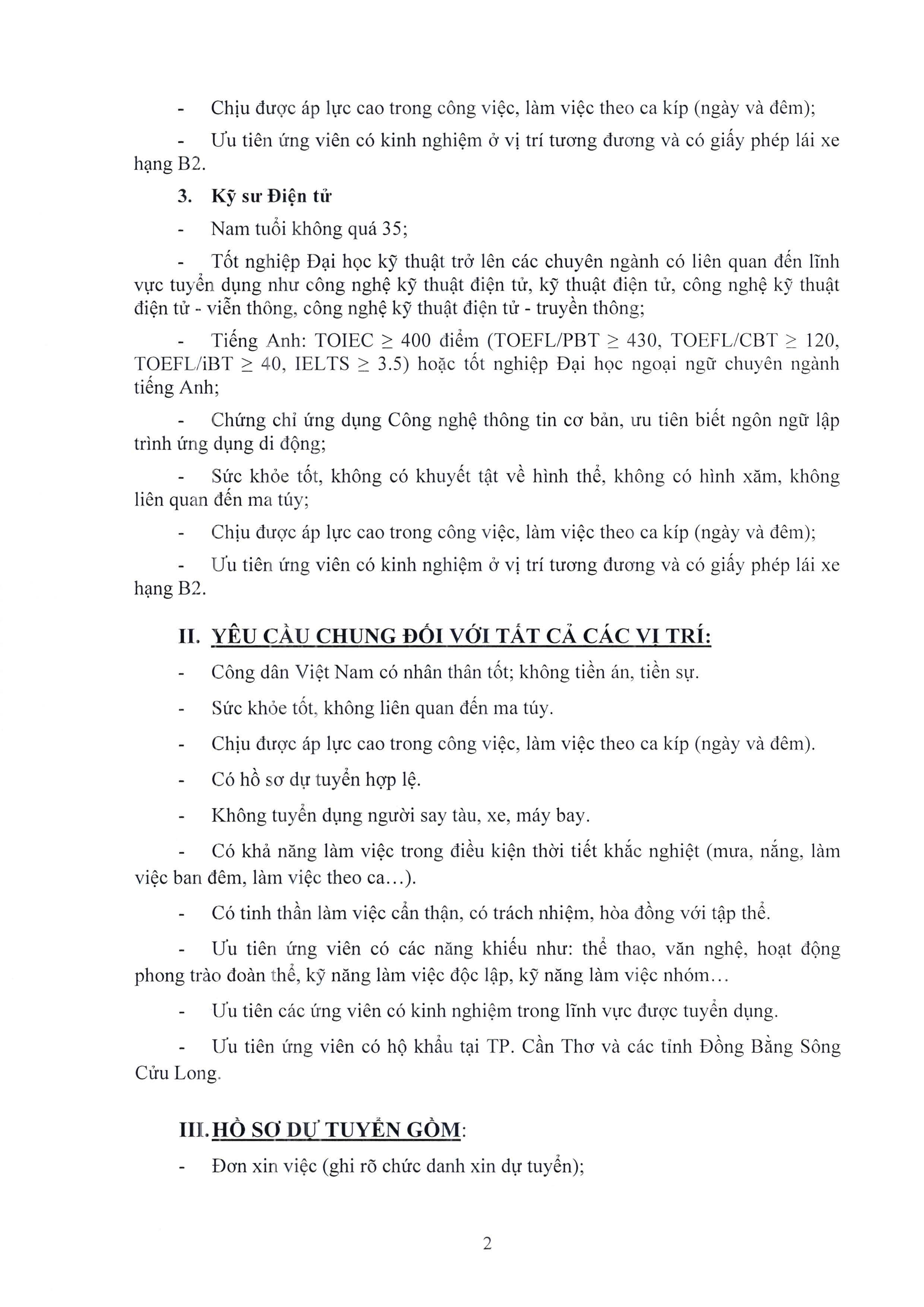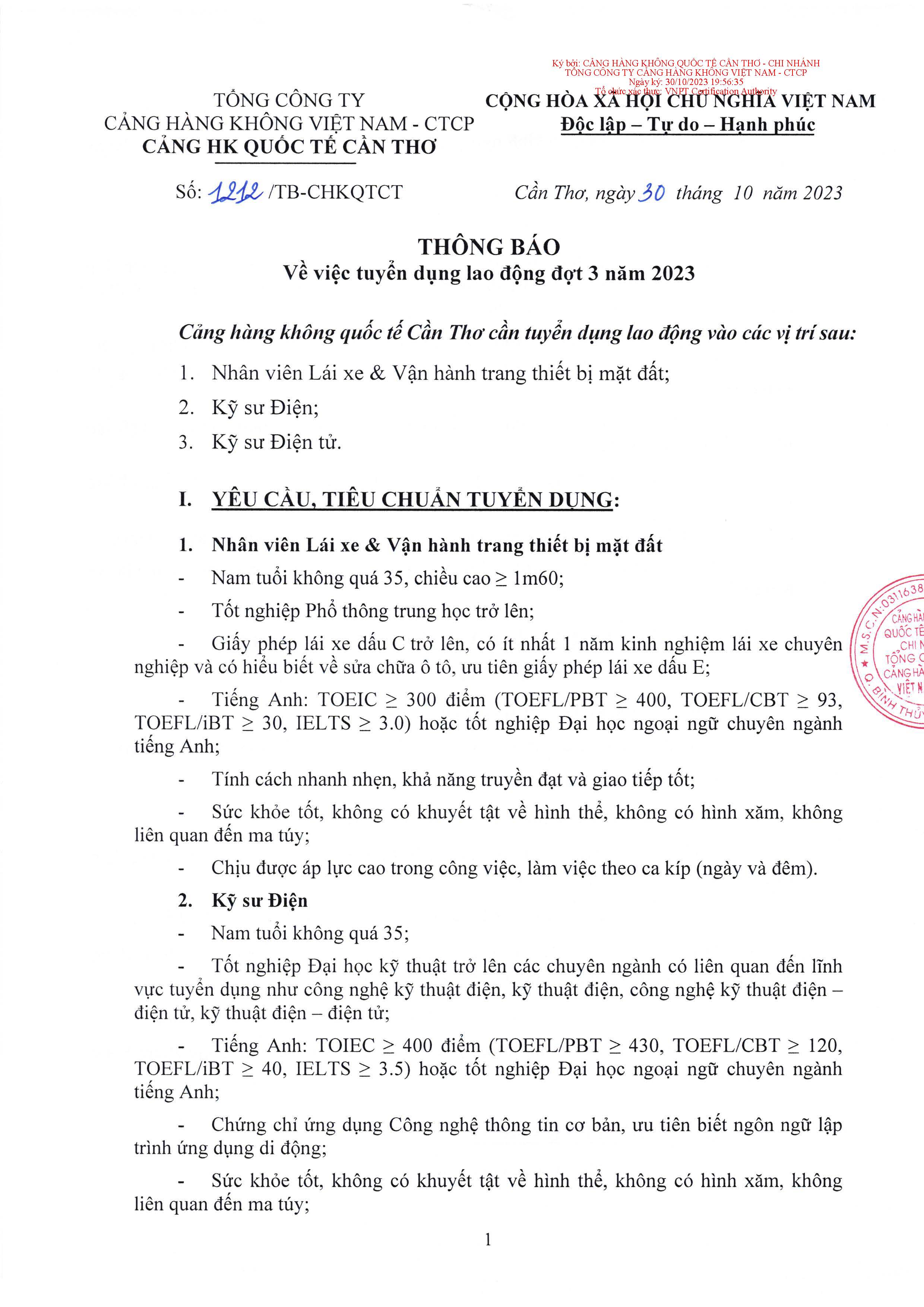 Cảng hàng không quốc tế Cần Thơ cần tuyển dụng lao động vào các vị trí sau: 1. Nhân viên Lái xe & Vận hành trang thiết bị mặt đất; 2. Kỹ sư Điện; 3. Kỹ sư Điện tử.