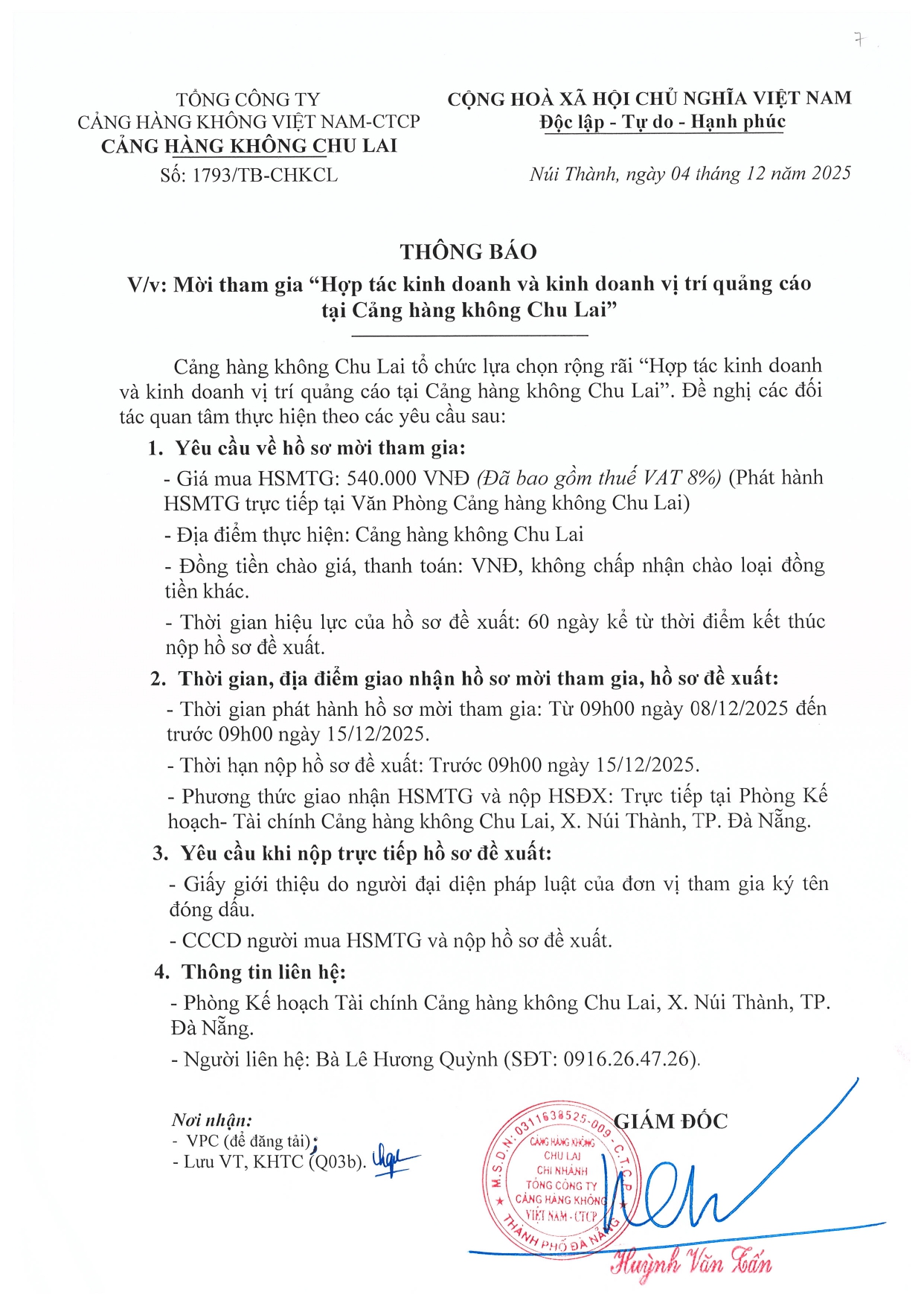 THÔNG BÁO VỀ VIỆC MỜI THAM GIA "HỢP TÁC KINH DOANH VÀ KINH DOANH VỊ TRÍ QUẢNG CÁO TẠI CẢNG HÀNG KHÔNG CHU LAI"