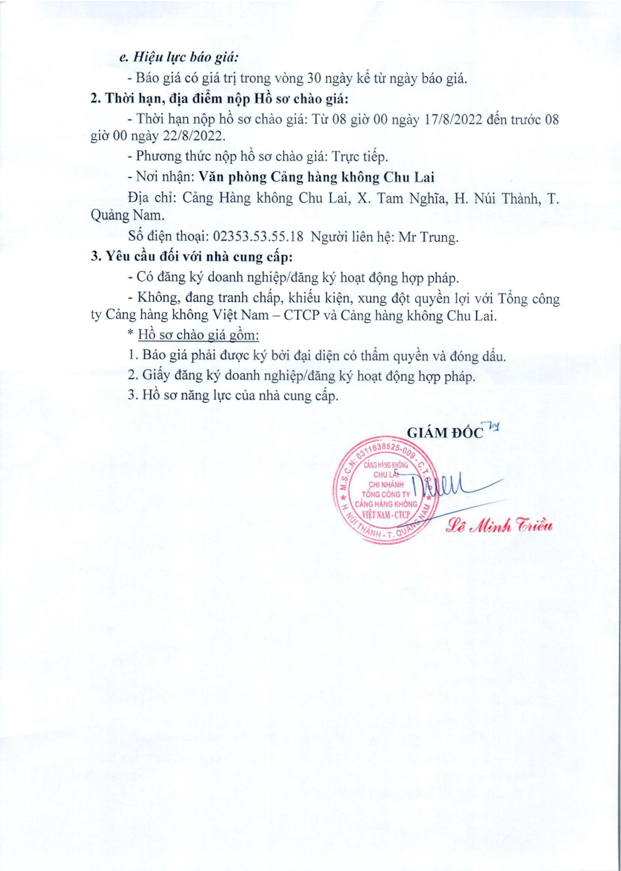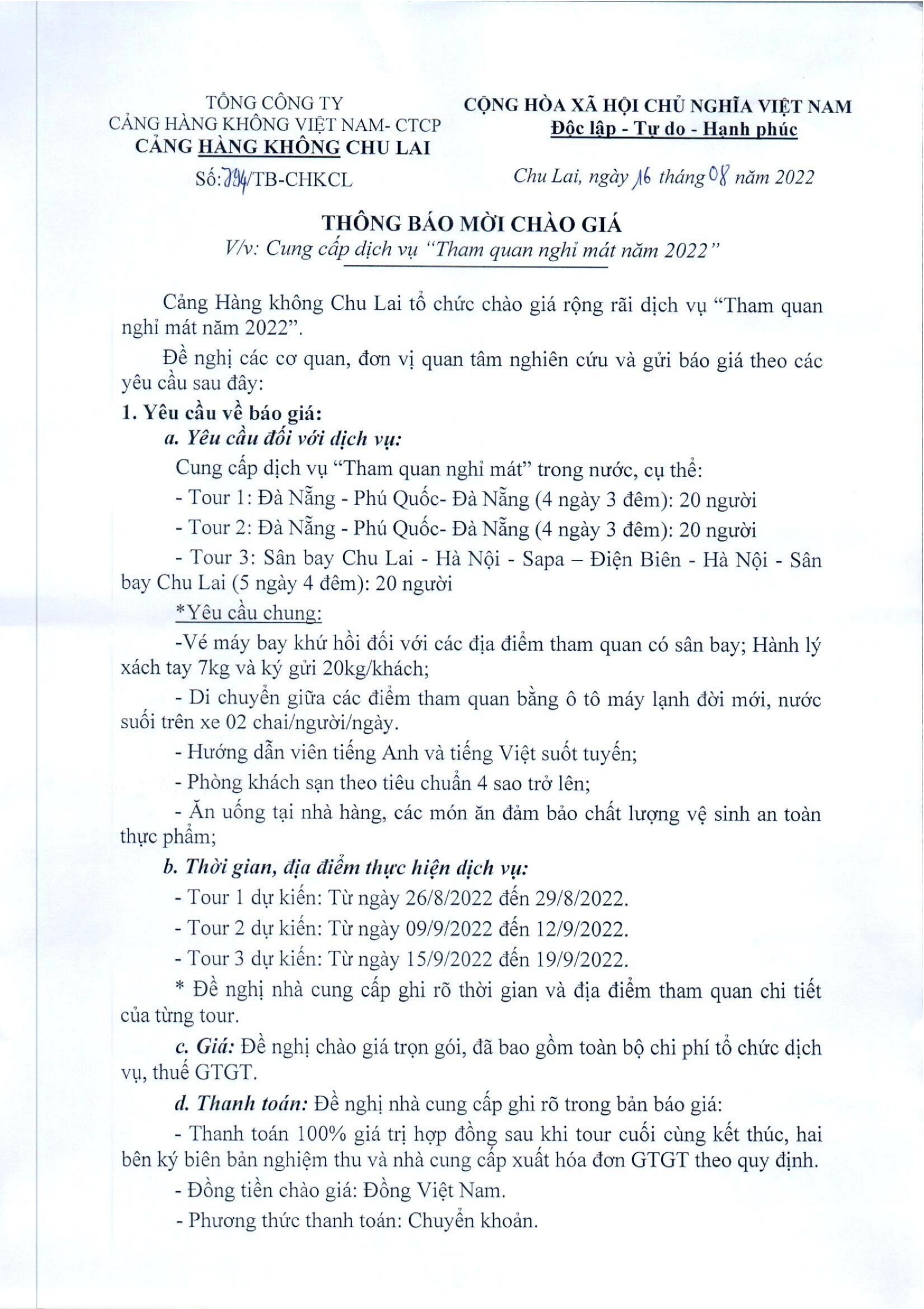 Cảng hàng không Chu Lai thông báo mời chào giá: Cung cấp dịch vụ tham quan nghỉ mát năm 2022.