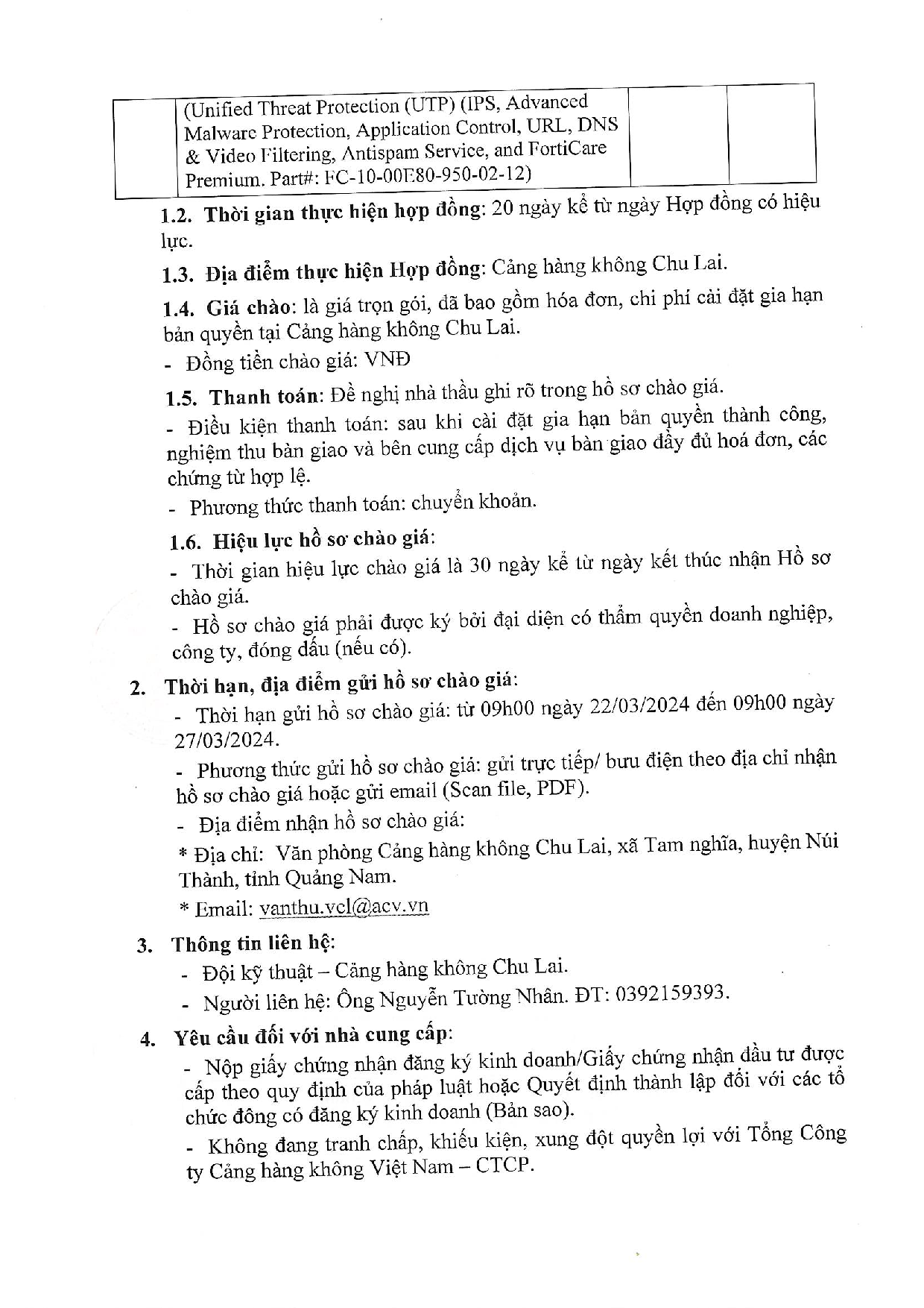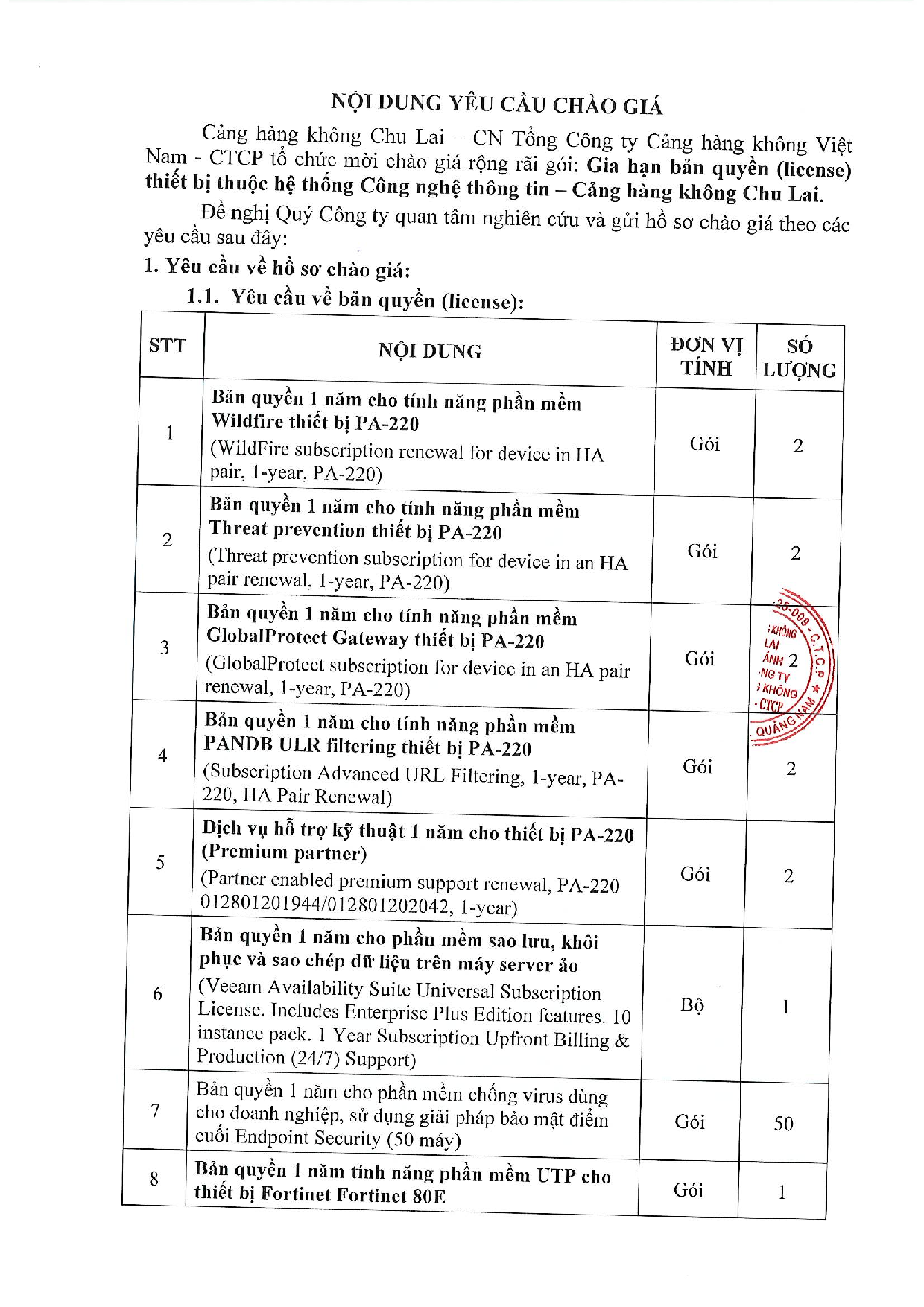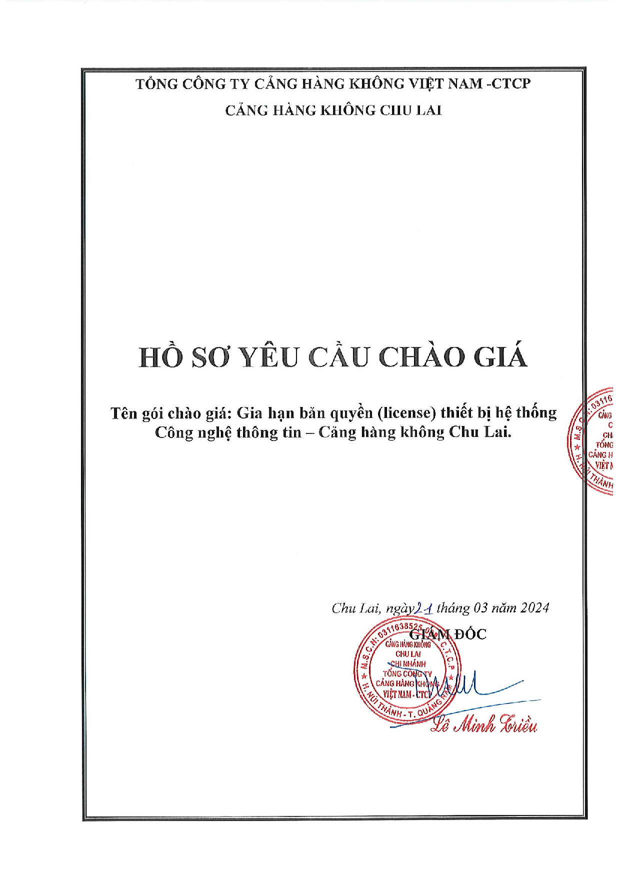 Cảng hàng không Chu Lai thông báo Mời chào giá gói thầu: Gia hạn bản quyền (license) thiết bị thuộc hệ thống Công nghệ thông tin - Cảng hàng không Chu Lai
