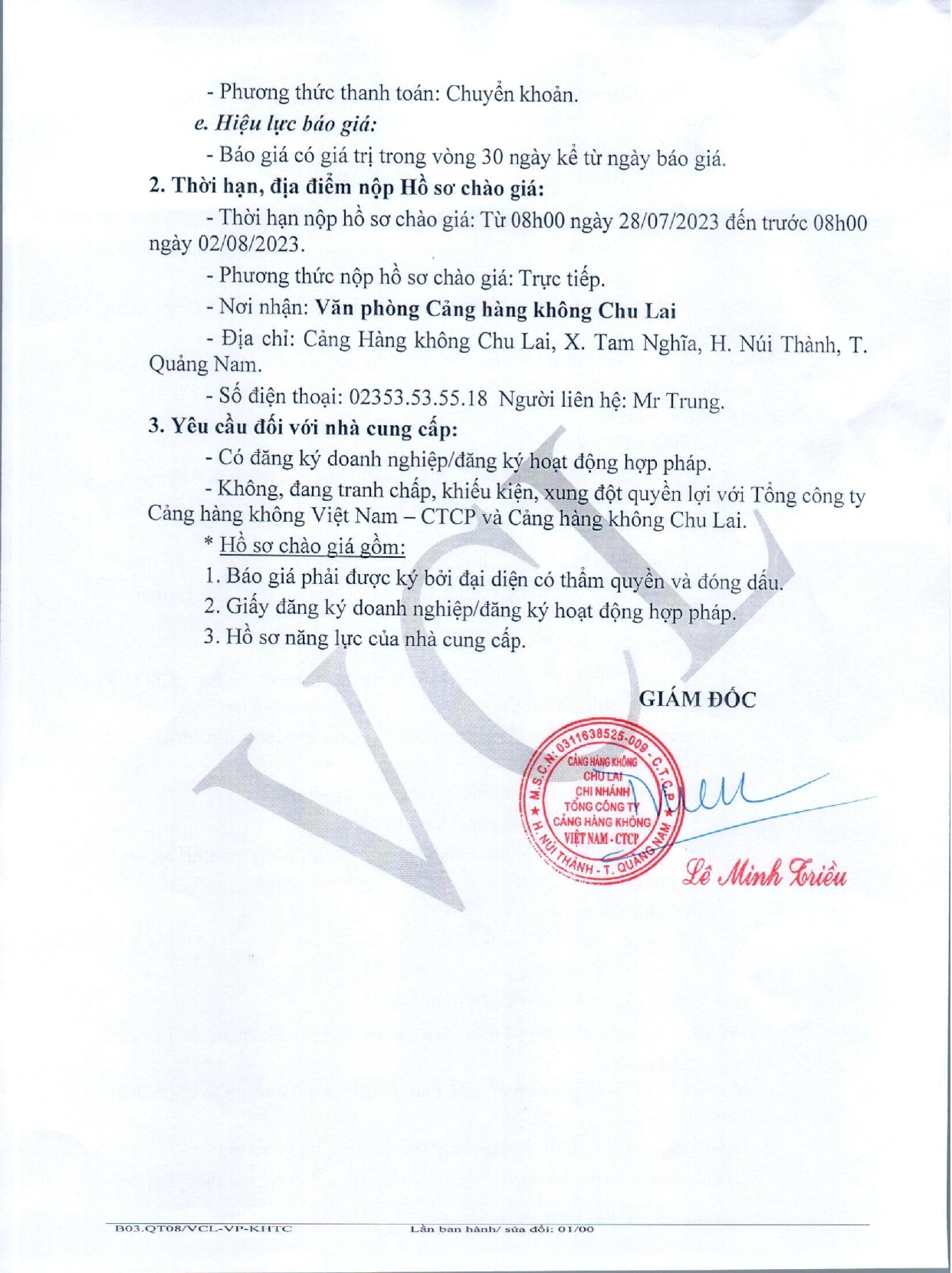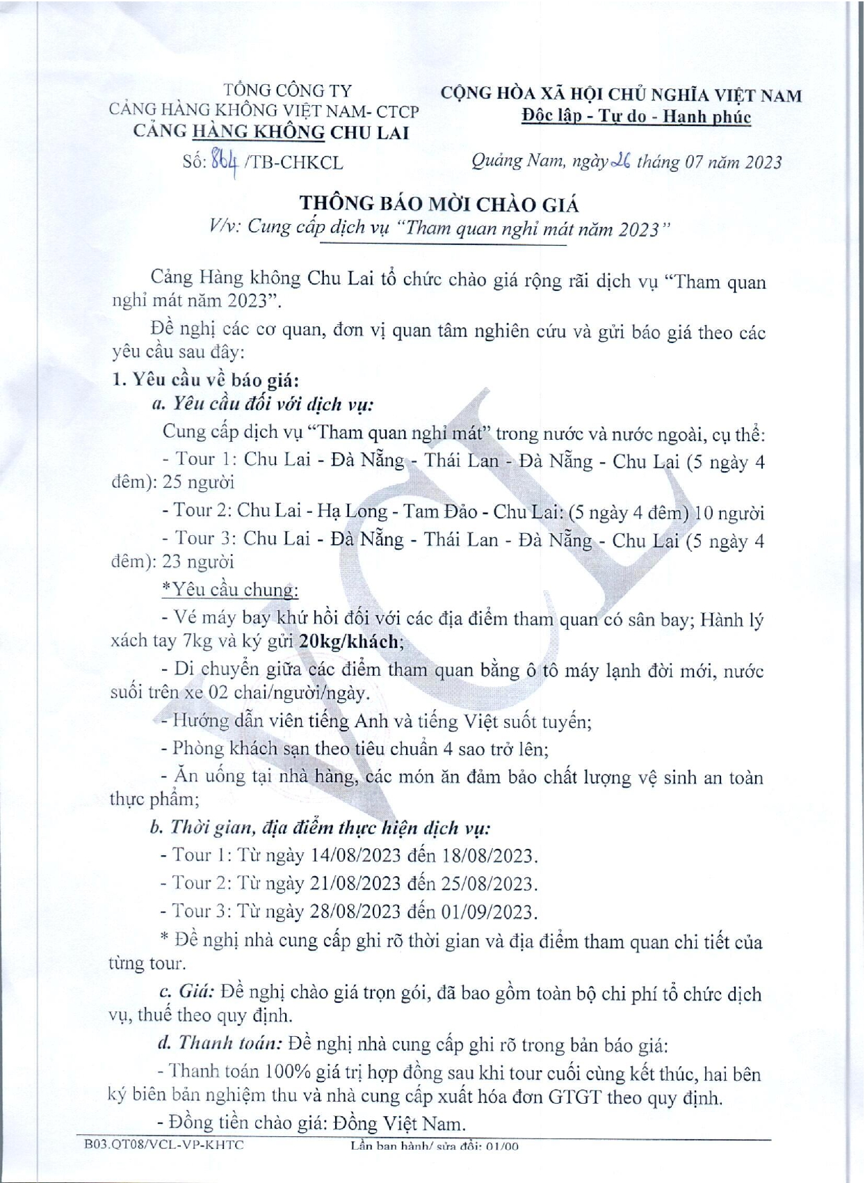 CẢNG HÀNG KHÔNG CHU LAI: THÔNG BÁO MỜI CHÀO GIÁ V/v Cung cấp dịch vụ tham quan nghỉ mát năm 2023