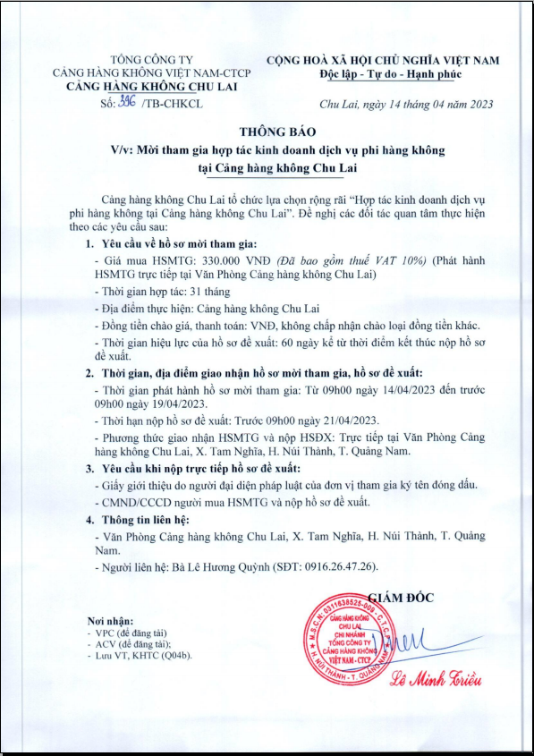 THÔNG BÁO VỀ VIỆC MỜI THAM GIA "HỢP TÁC KINH DOANH VÀ KINH DOANH VỊ TRÍ QUẢNG CÁO TẠI CẢNG HÀNG KHÔNG CHU LAI"