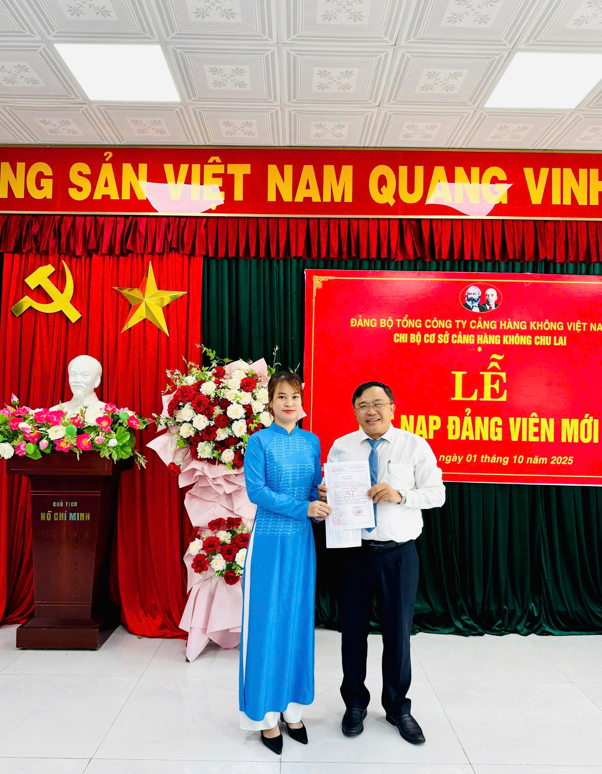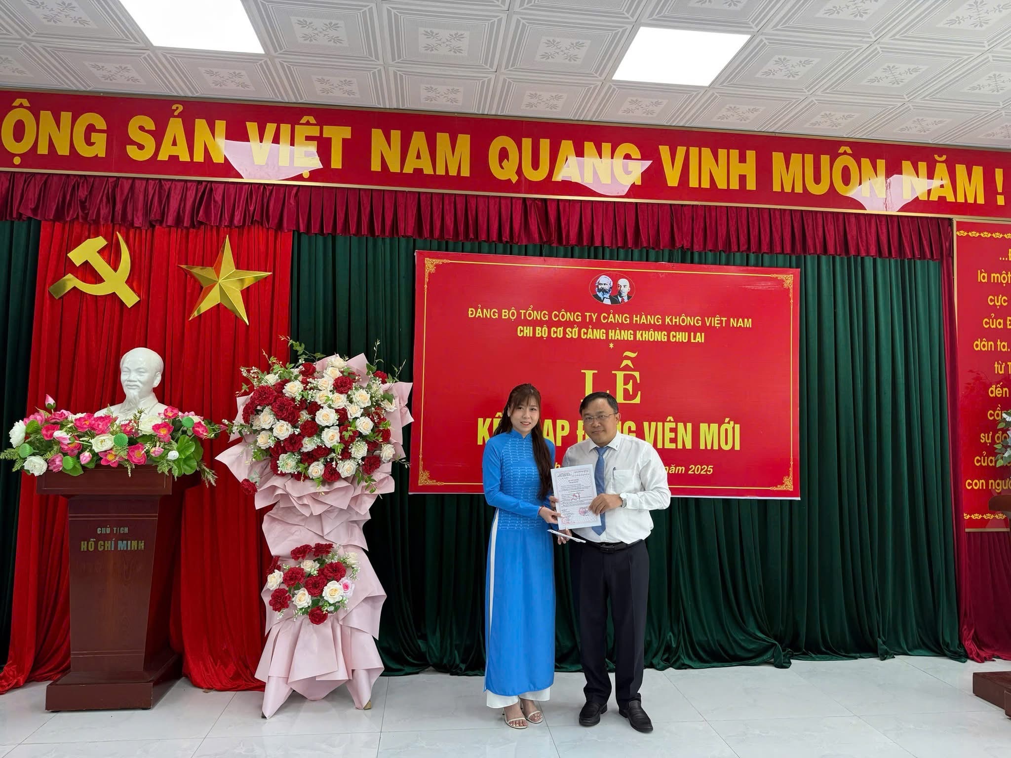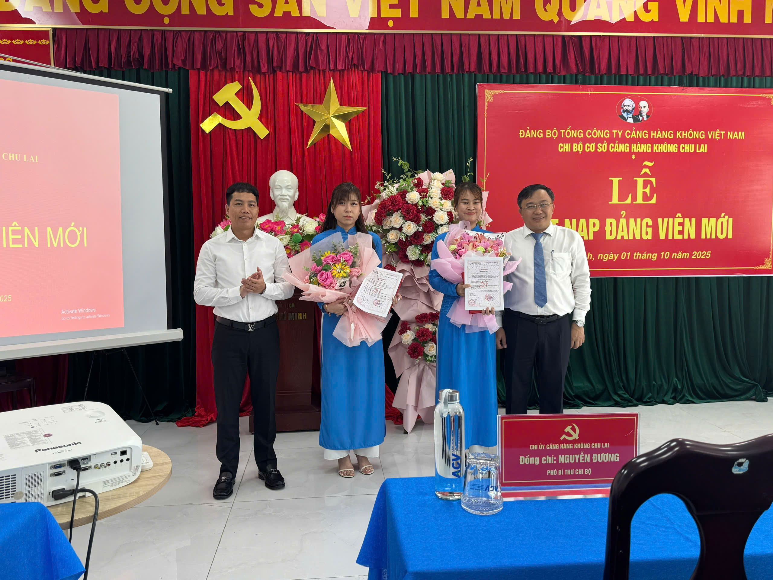 Thực hiện Kế hoạch số 43-KH/CB của Chi bộ về việc tổ chức Lễ kết nạp Đảng viên mới. Ngày 01/10/2025, Chi bộ cơ sở Cảng hàng không Chu Lai đã long trọng tổ chức Lễ kết nạp Đảng viên cho 02 quần chúng ưu tú, nhằm ghi nhận và khẳng định sự nỗ lực phấn đấu, rèn luyện của các đồng chí trong suốt thời gian qua.
