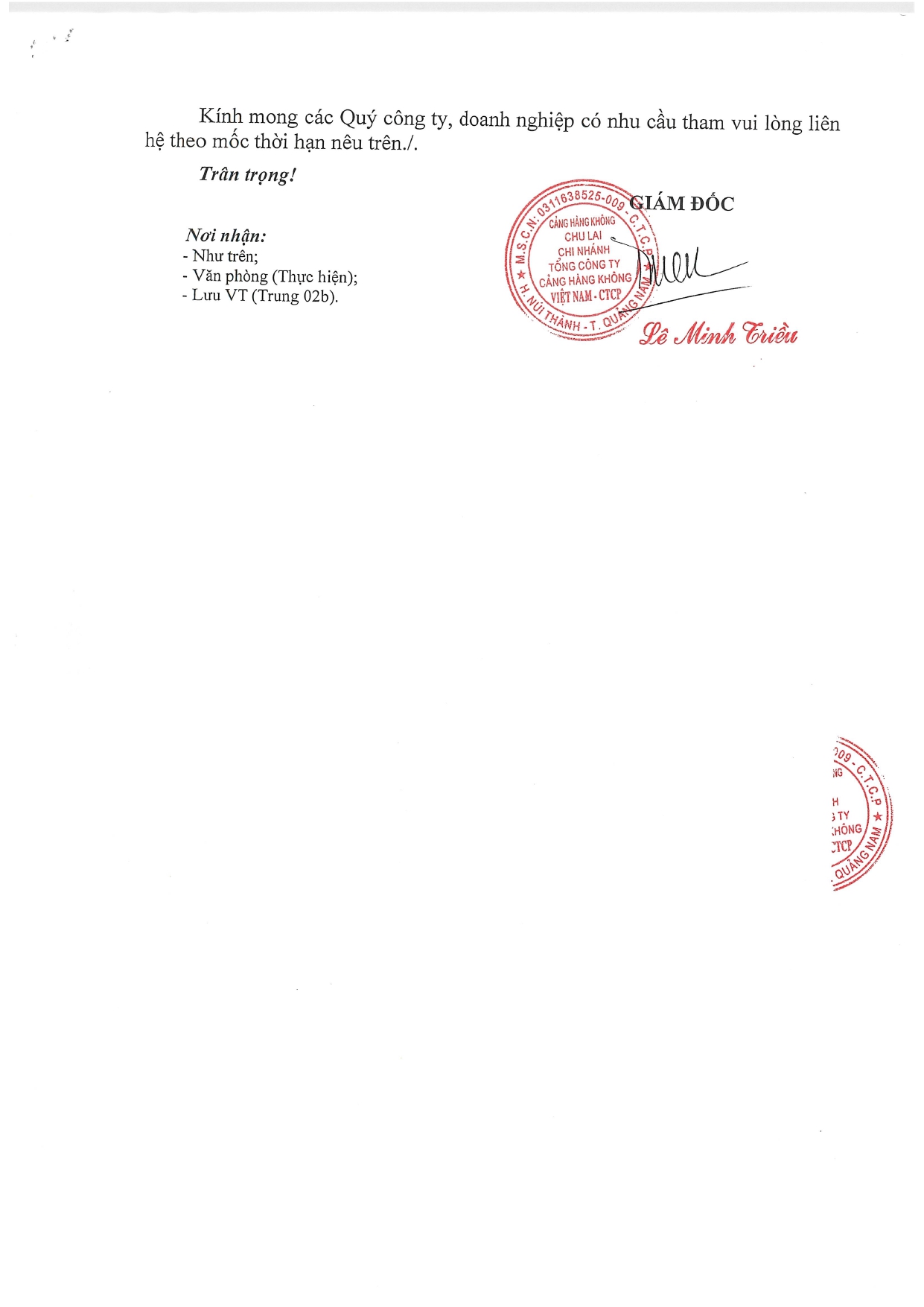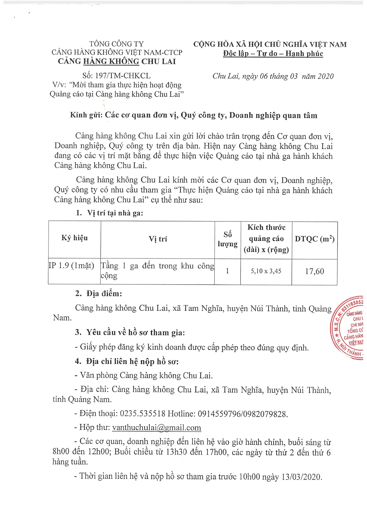 THÔNG BÁO VỀ VIỆC MỜI THAM GIA "HỢP TÁC KINH DOANH VÀ KINH DOANH VỊ TRÍ QUẢNG CÁO TẠI CẢNG HÀNG KHÔNG CHU LAI"
