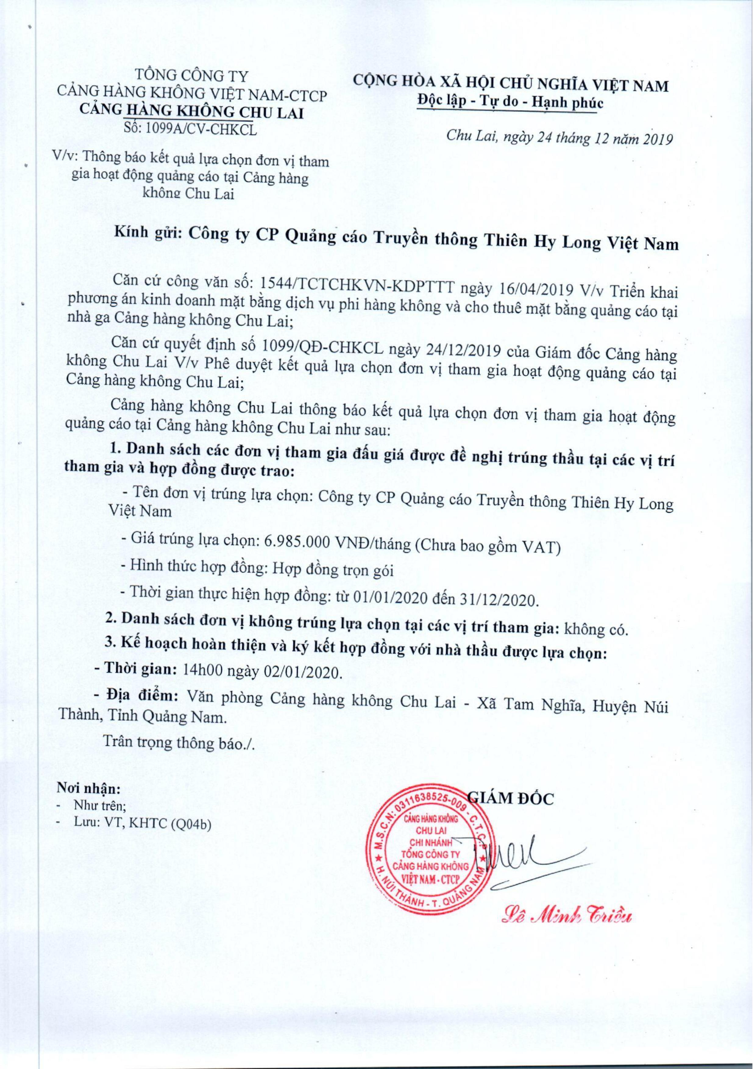 Thông báo kết quả lựa chọn đơn vị tham gia hoạt động quảng cáo tại Cảng hàng không Chu Lai