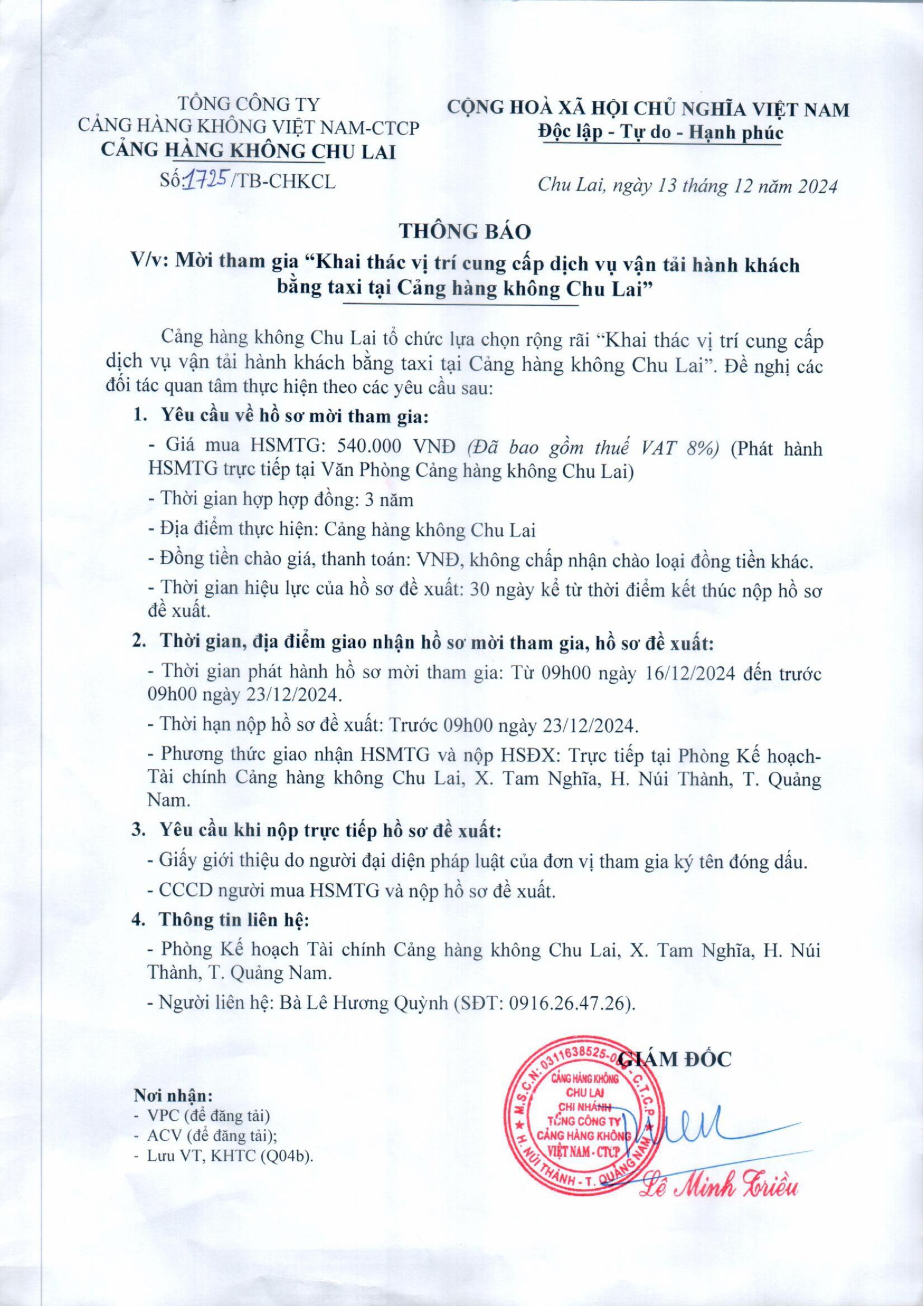 THÔNG BÁO MỜI THAM GIA "KHAI THÁC VỊ TRÍ CUNG CẤP DỊCH VỤ VẬN TẢI HÀNH KHÁCH BẰNG TAXI TẠI CẢNG HÀNG KHÔNG CHU LAI"