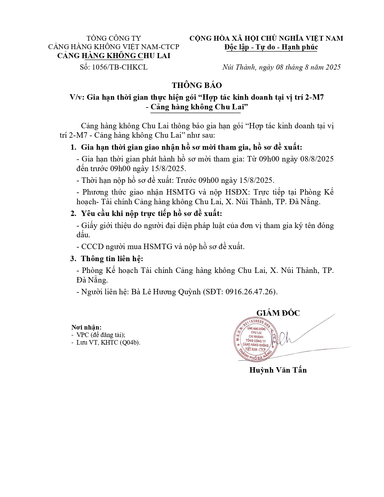 THÔNG BÁO VỀ VIỆC GIA HẠN THỜI GIAN THỰC HIỆN GÓI "HỢP TÁC KINH DOANH TẠI VỊ TRÍ 2-M7 - CẢNG HÀNG KHÔNG CHU LAI"