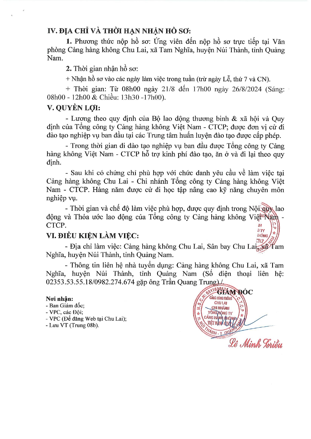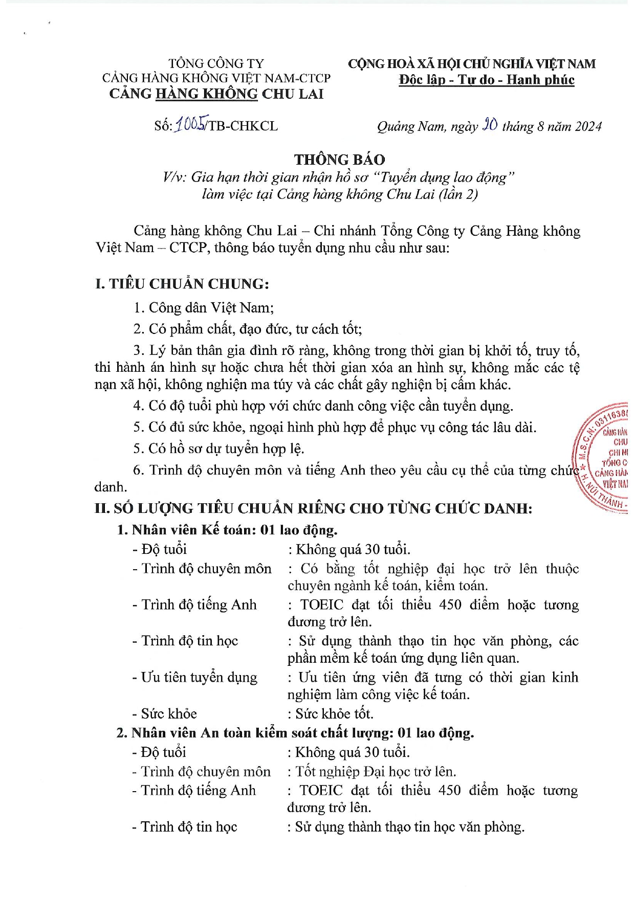CẢNG HÀNG KHÔNG CHU LAI: THÔNG BÁO GIA HẠN THỜI GIAN NHẬN HỒ SƠ "TUYỂN DỤNG LAO ĐỘNG" LÀM VIỆC TẠI CẢNG HÀNG KHÔNG CHU LAI (LẦN 2)