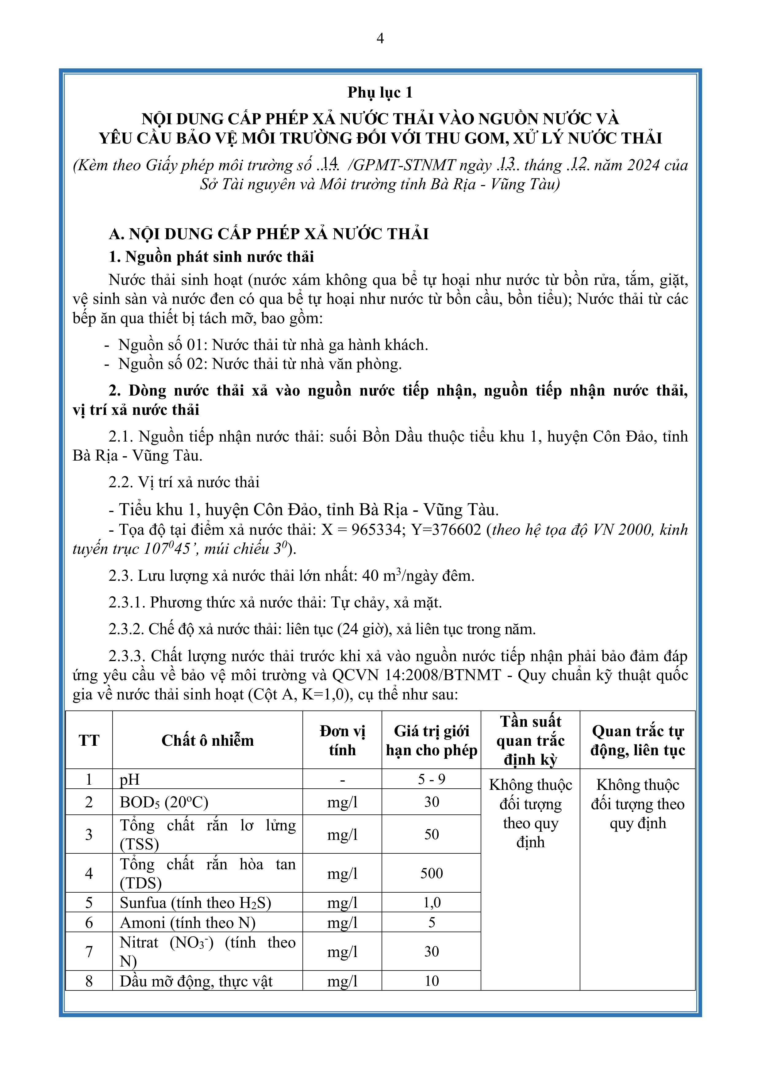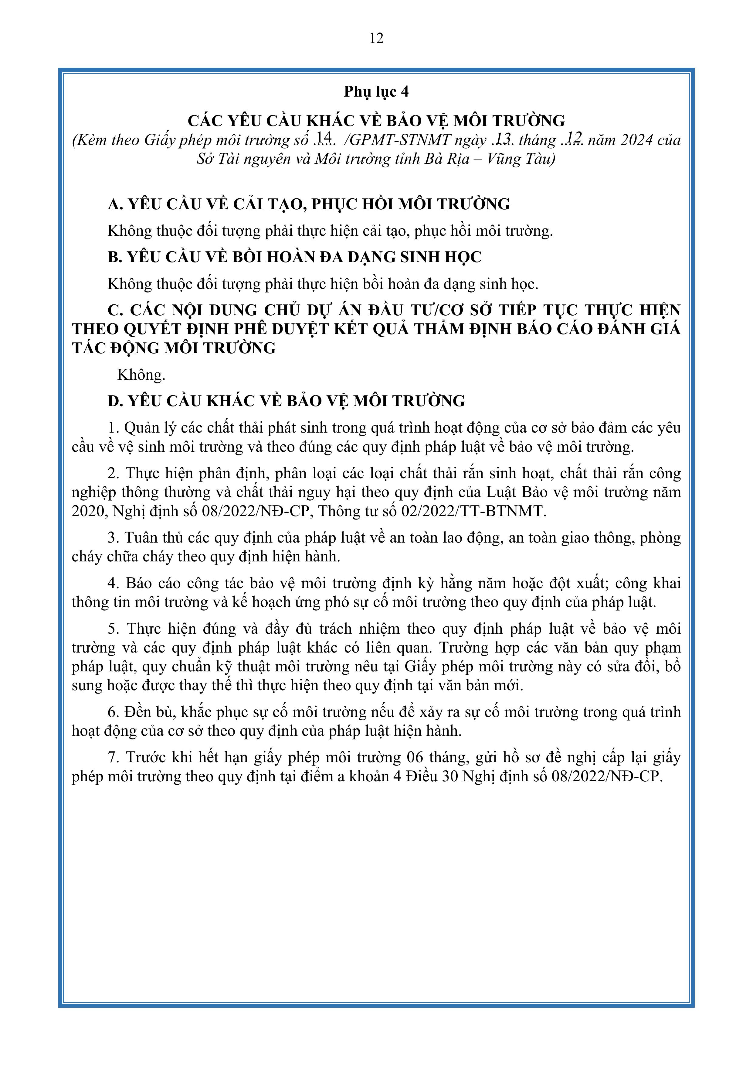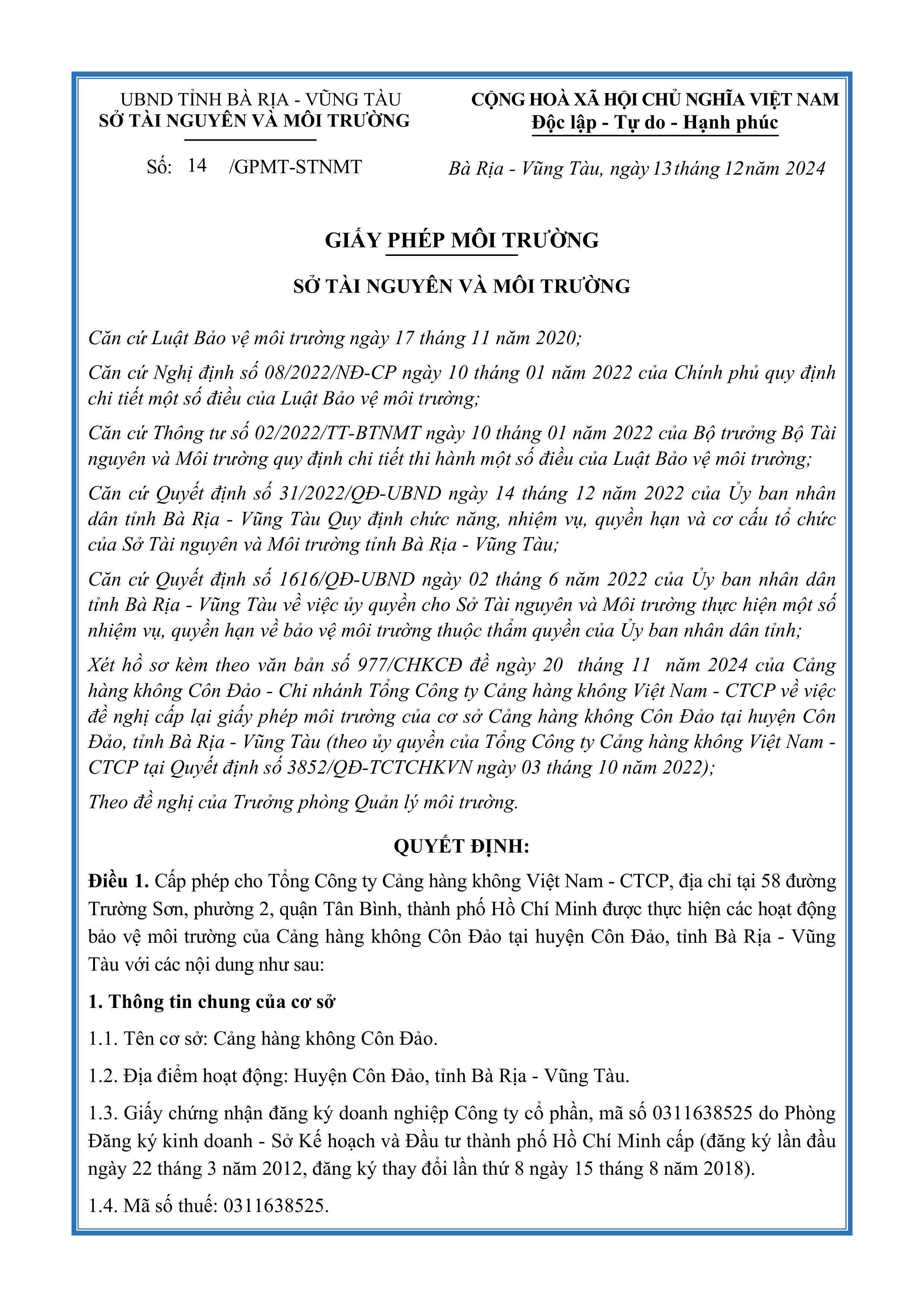 Giấy phép môi trường số 14/GPMT-STNMT do Tỉnh Bà Rịa Vũng Tàu cấp ngày 13 tháng 12 năm 2024.