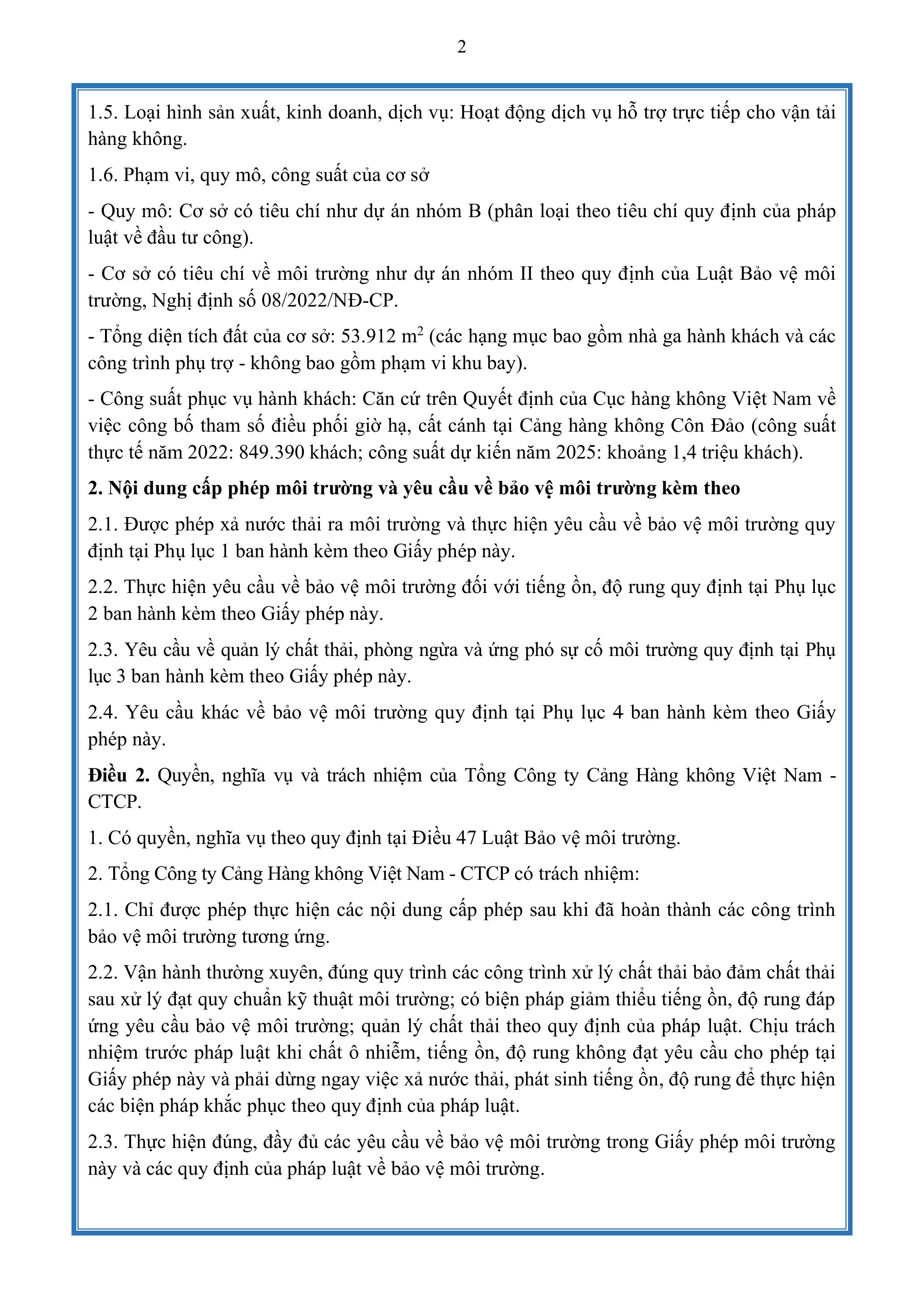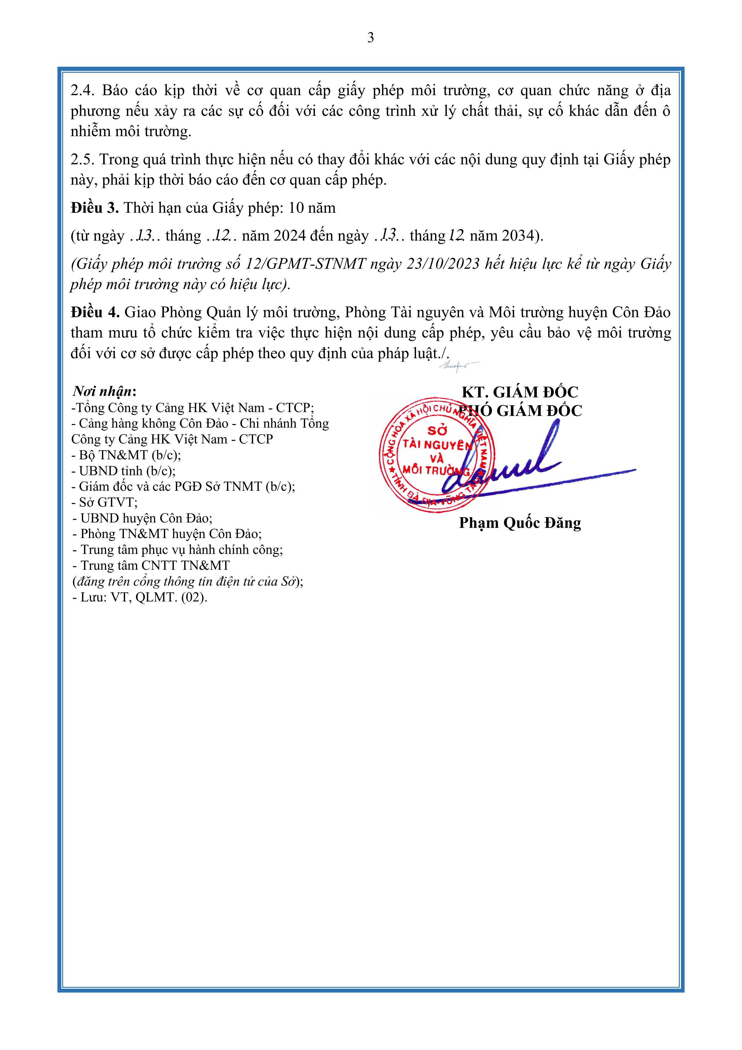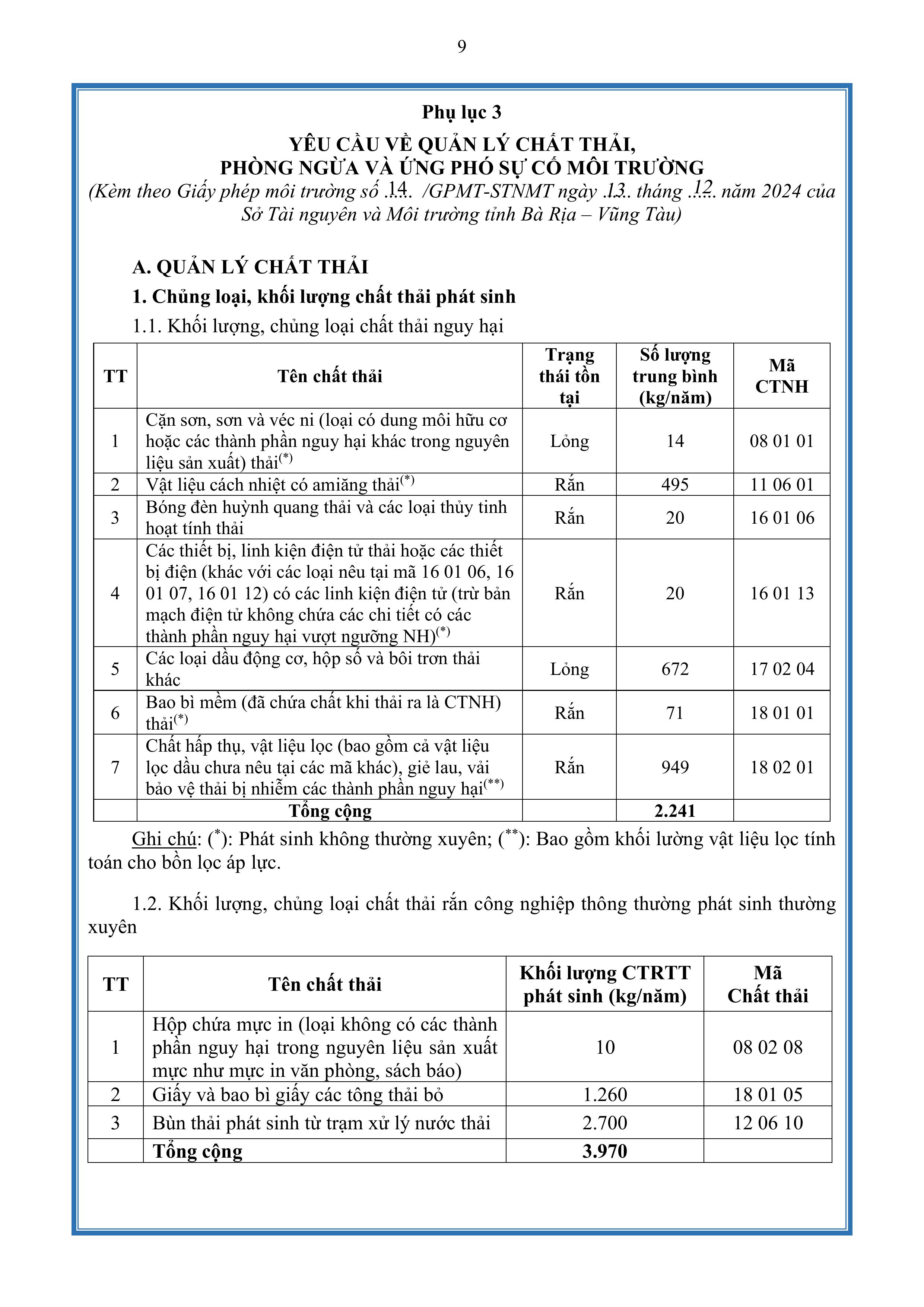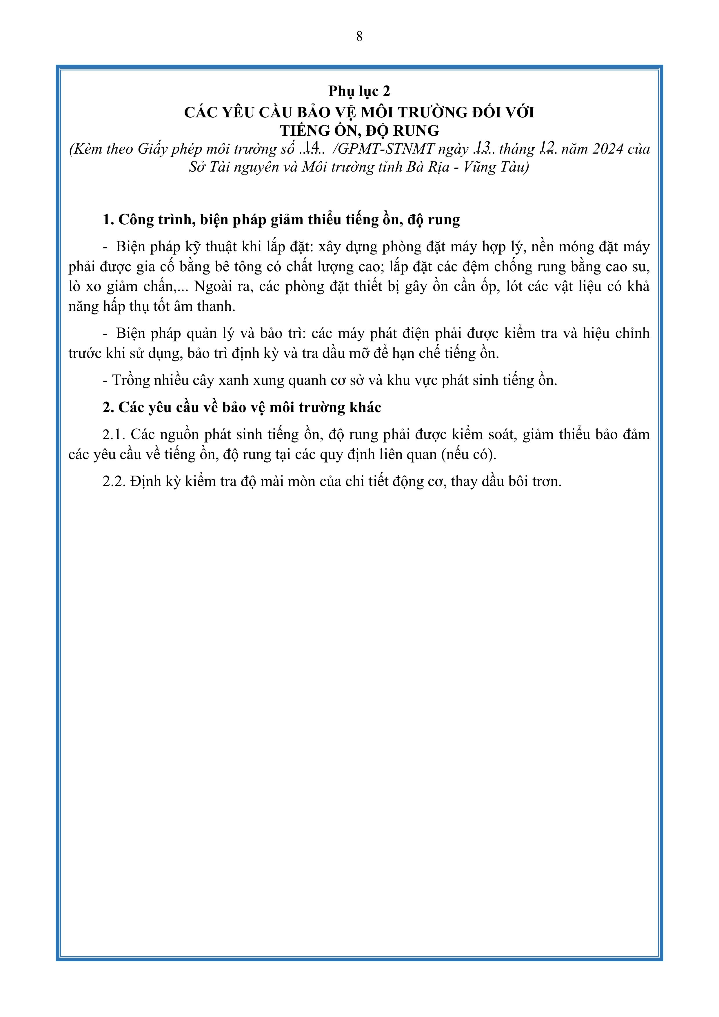 Giấy phép môi trường số 14/GPMT-STNMT do Tỉnh Bà Rịa Vũng Tàu cấp ngày 13 tháng 12 năm 2024.