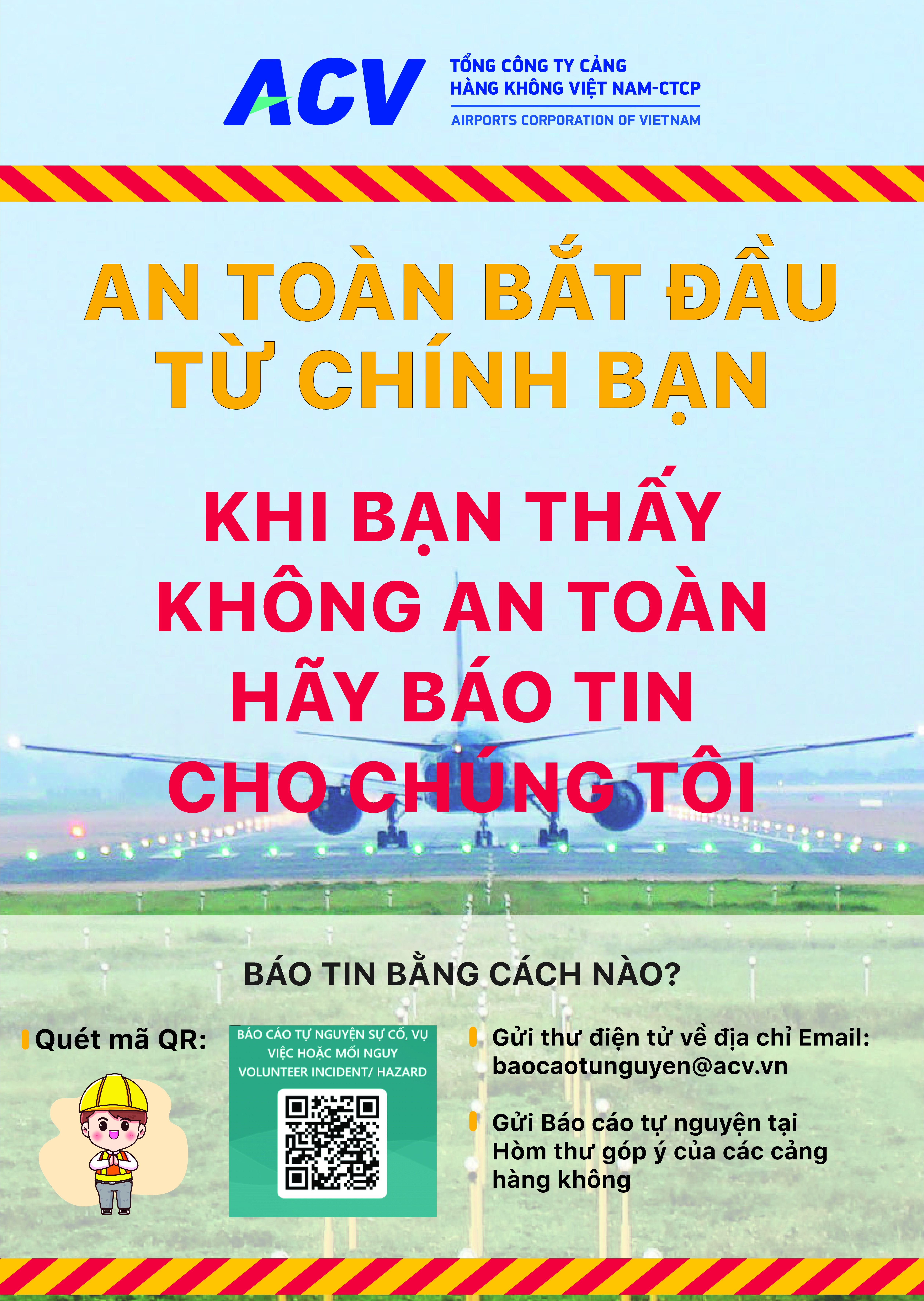 Ngay bên dưới là khẩu hiệu “Khi bạn thấy không an toàn, hãy báo tin cho chúng tôi”, được in đậm màu đỏ – màu của cảnh báo và hành động. Câu nói ngắn gọn, dễ hiểu này kêu gọi mọi cán bộ, nhân viên và đối tác làm việc tại sân bay cùng tham gia giám sát, phát hiện và báo cáo kịp thời các tình huống, hành vi hoặc hiện tượng có nguy cơ gây mất an toàn.