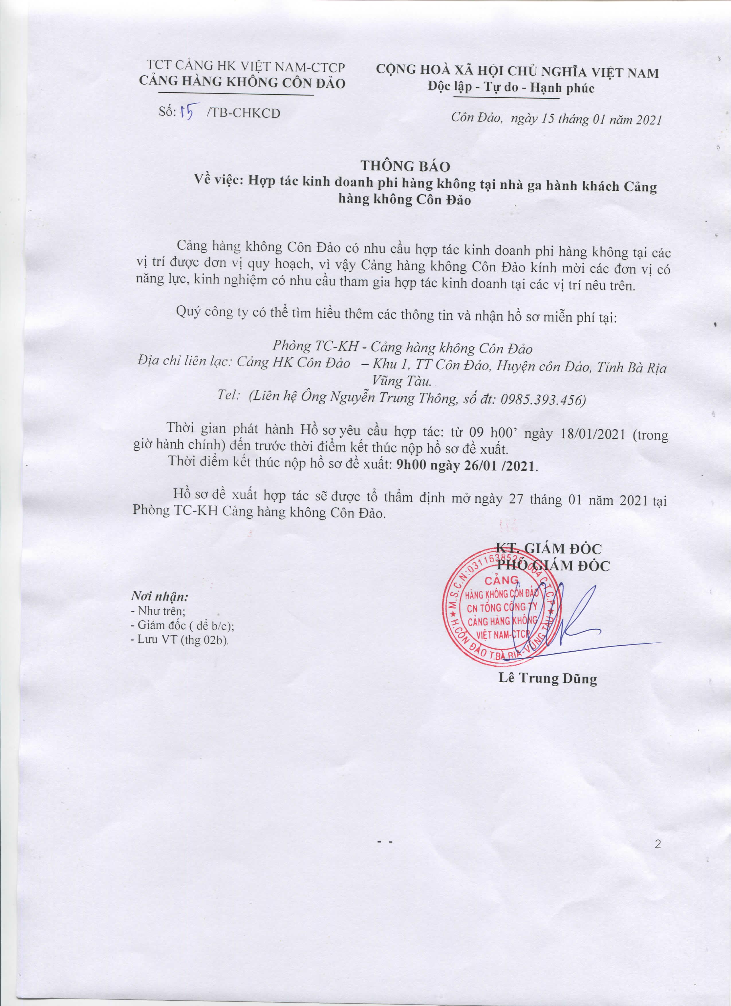 Thông báo V/v: kết quả chào giá "Cung cấp dịch vụ thu gom, vận chuyển và xử lý chất thải nguy hại tại Cảng hàng không Côn Đảo"