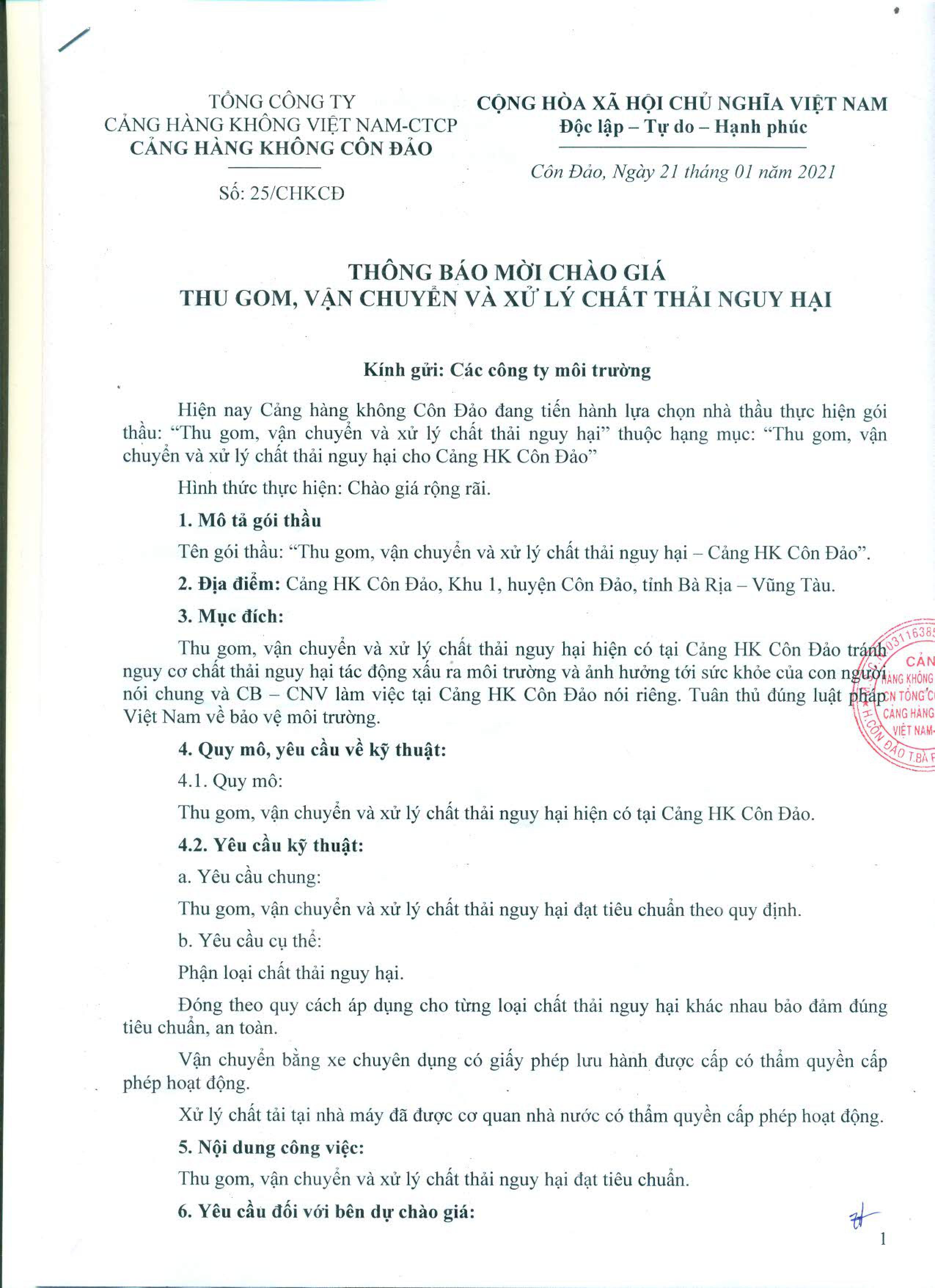 Thông báo V/v: kết quả chào giá "Cung cấp dịch vụ thu gom, vận chuyển và xử lý chất thải nguy hại tại Cảng hàng không Côn Đảo"