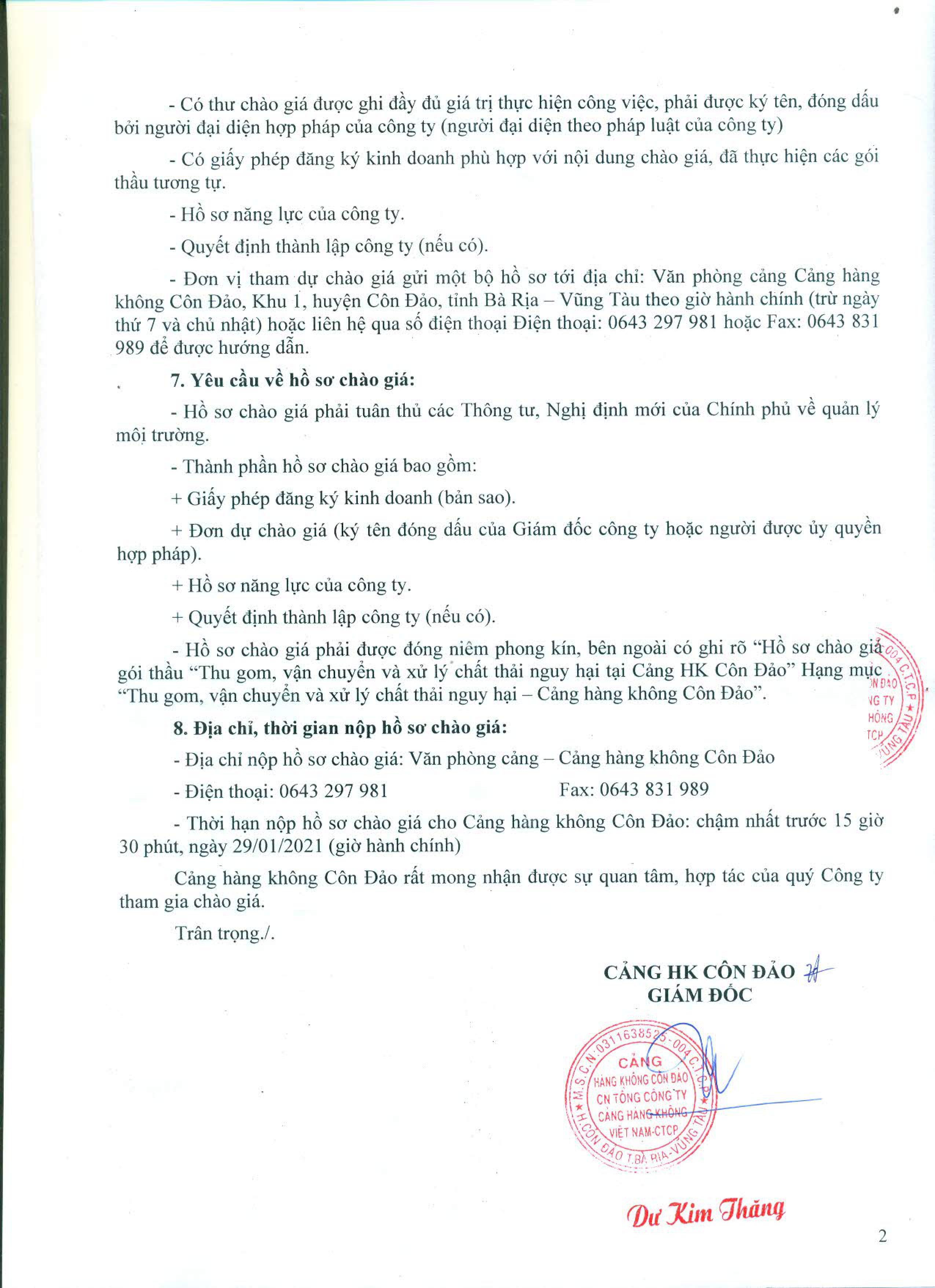 THÔNG BÁO MỜI CHÀO GIÁ (Lần 3) Về việc: "Cung cấp dịch vụ thu gom, vận chuyển và xử lý chất thải nguy hại tại Cảng hàng không Côn Đảo"