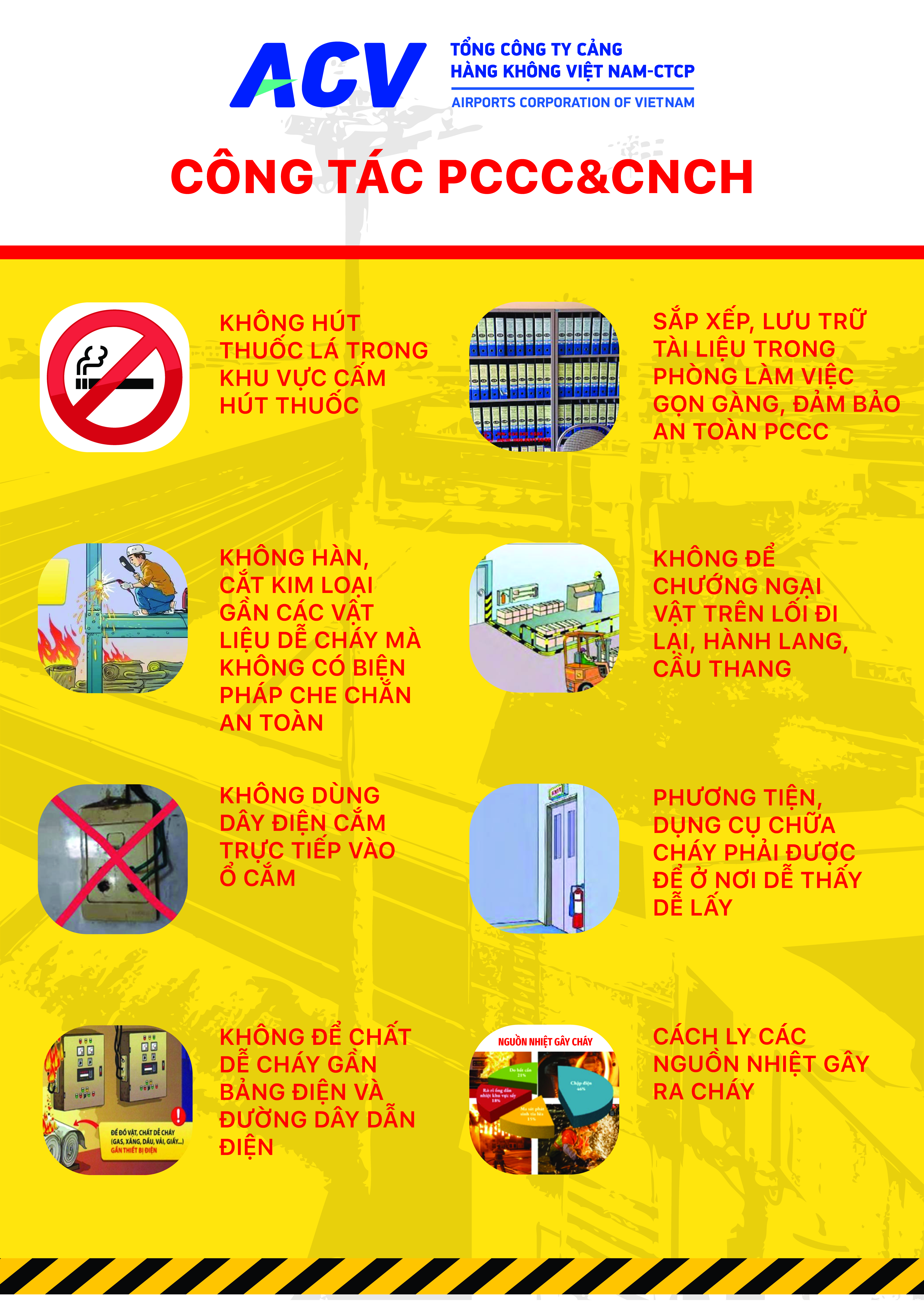 Poster tuyên truyền “Công tác PCCC&CNCH” của Tổng công ty Cảng hàng không Việt Nam (ACV) là một sản phẩm truyền thông trực quan, sinh động và có tính giáo dục cao. Nội dung poster tập trung nhấn mạnh các hành vi cần tuân thủ và những vi phạm cần tránh nhằm đảm bảo an toàn phòng cháy, chữa cháy trong môi trường làm việc hàng không – nơi đòi hỏi kỷ luật, chính xác và an toàn tuyệt đối.