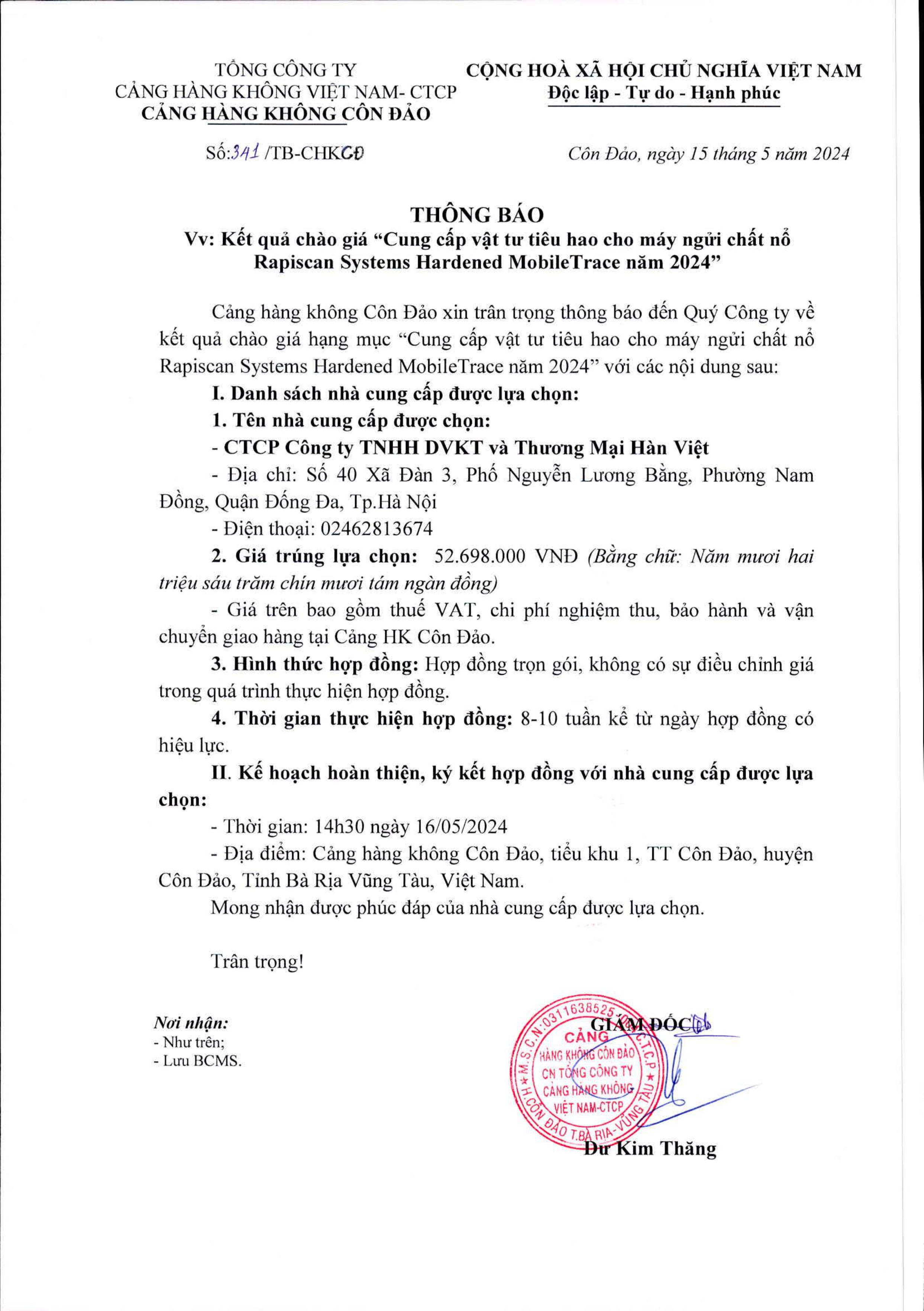 Thông báo V/v: kết quả chào giá "Cung cấp dịch vụ thu gom, vận chuyển và xử lý chất thải nguy hại tại Cảng hàng không Côn Đảo"