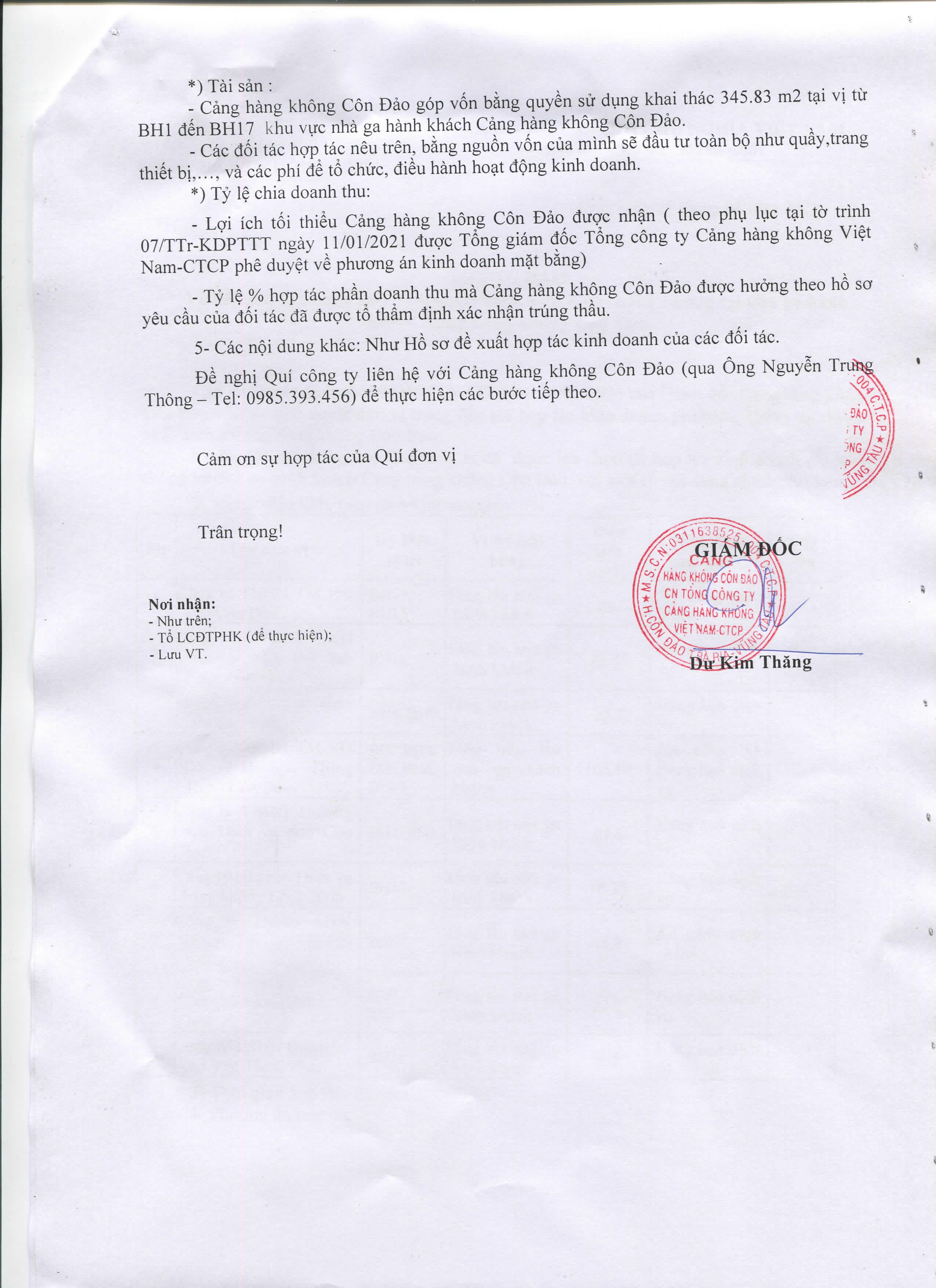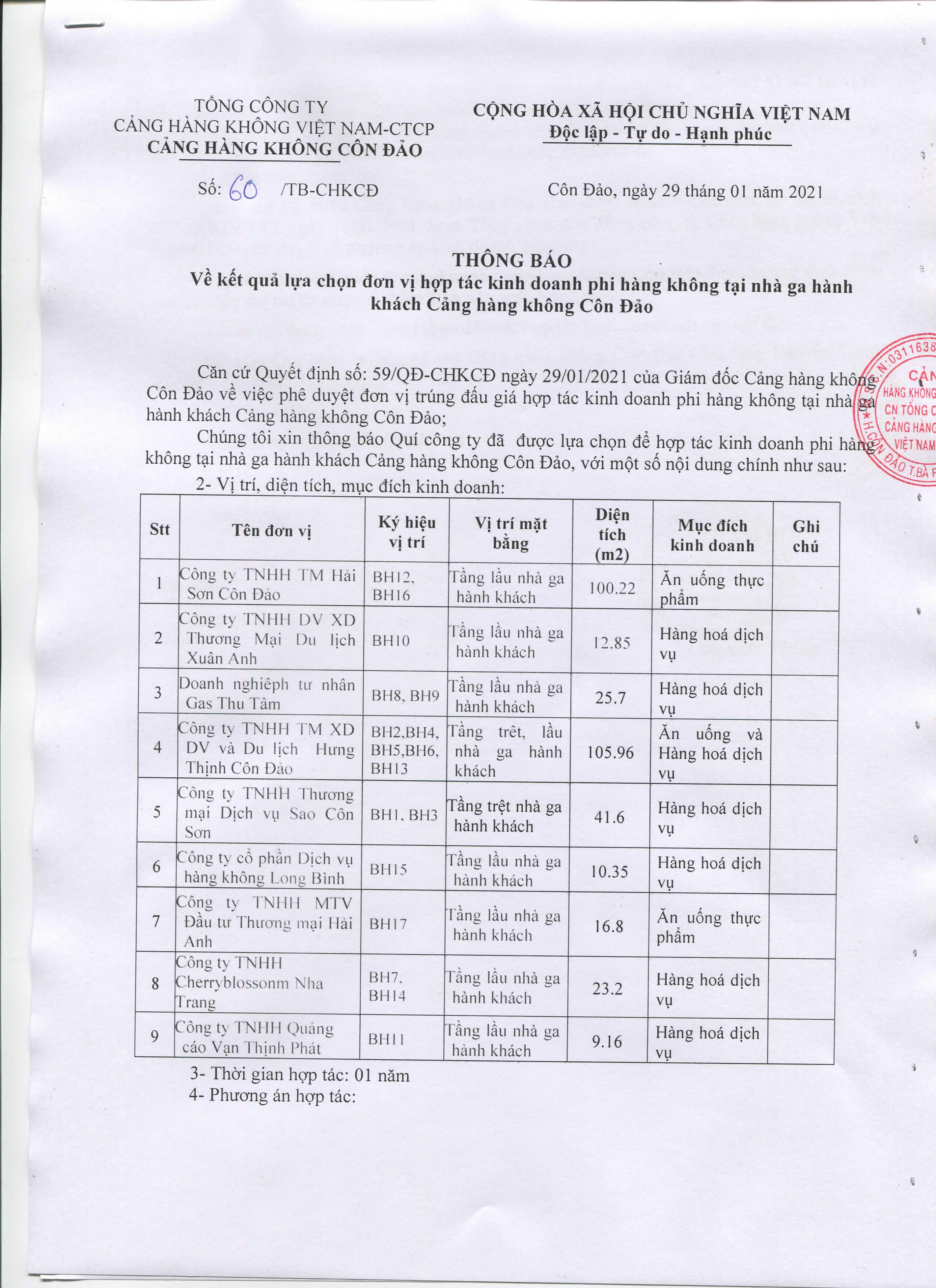 KẾT QUẢ LỰA CHỌN ĐƠN VỊ HỢP TÁC KINH DOANH PHI HÀNG KHÔNG TẠI NHÀ GA HÀNH KHÁCH CẢNG HÀNG KHÔNG CÔN ĐẢO