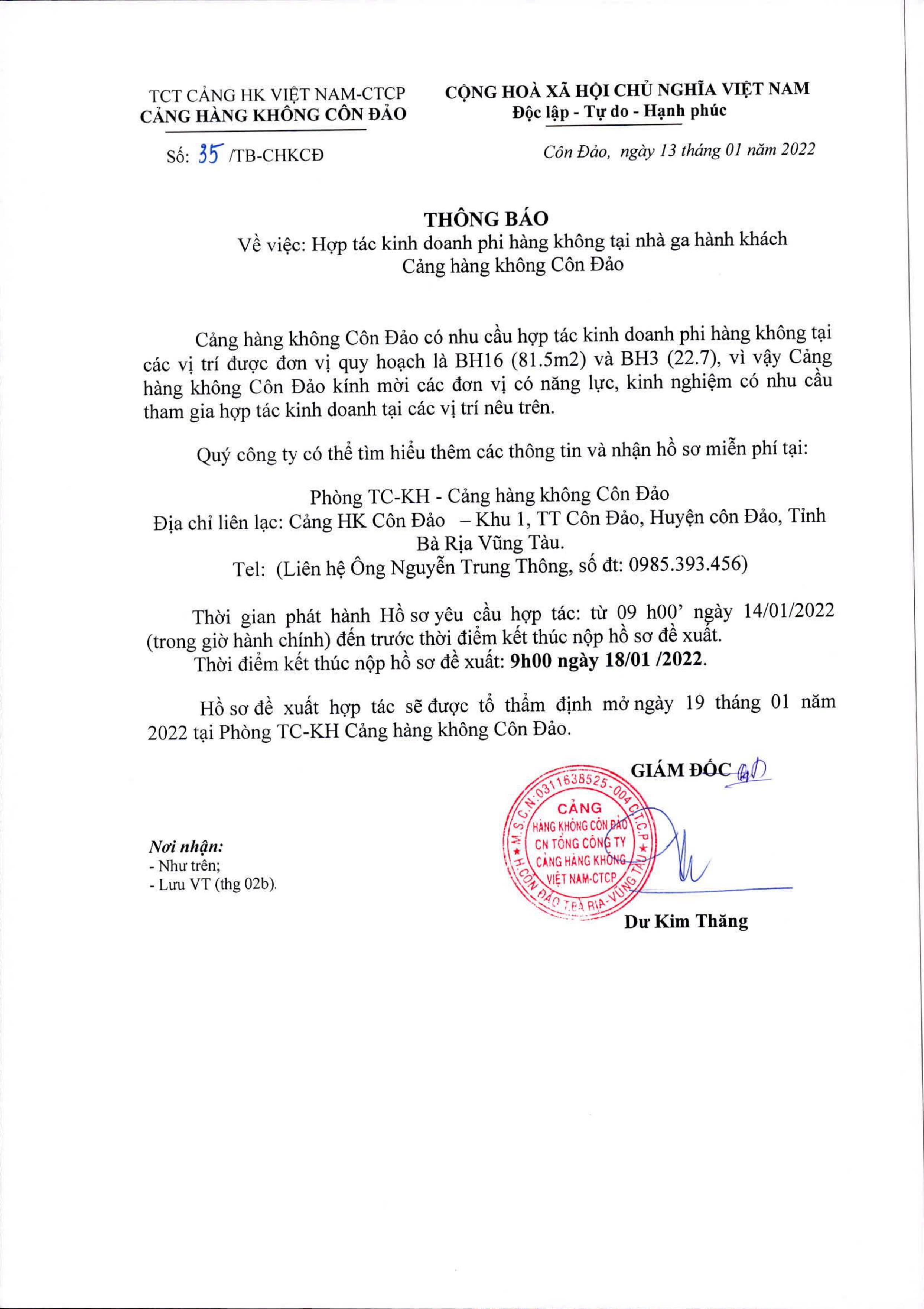Thông Báo - Hợp tác kinh doanh phi hàng không tại nhà ga hành khách Cảng Hàng Không Côn Đảo