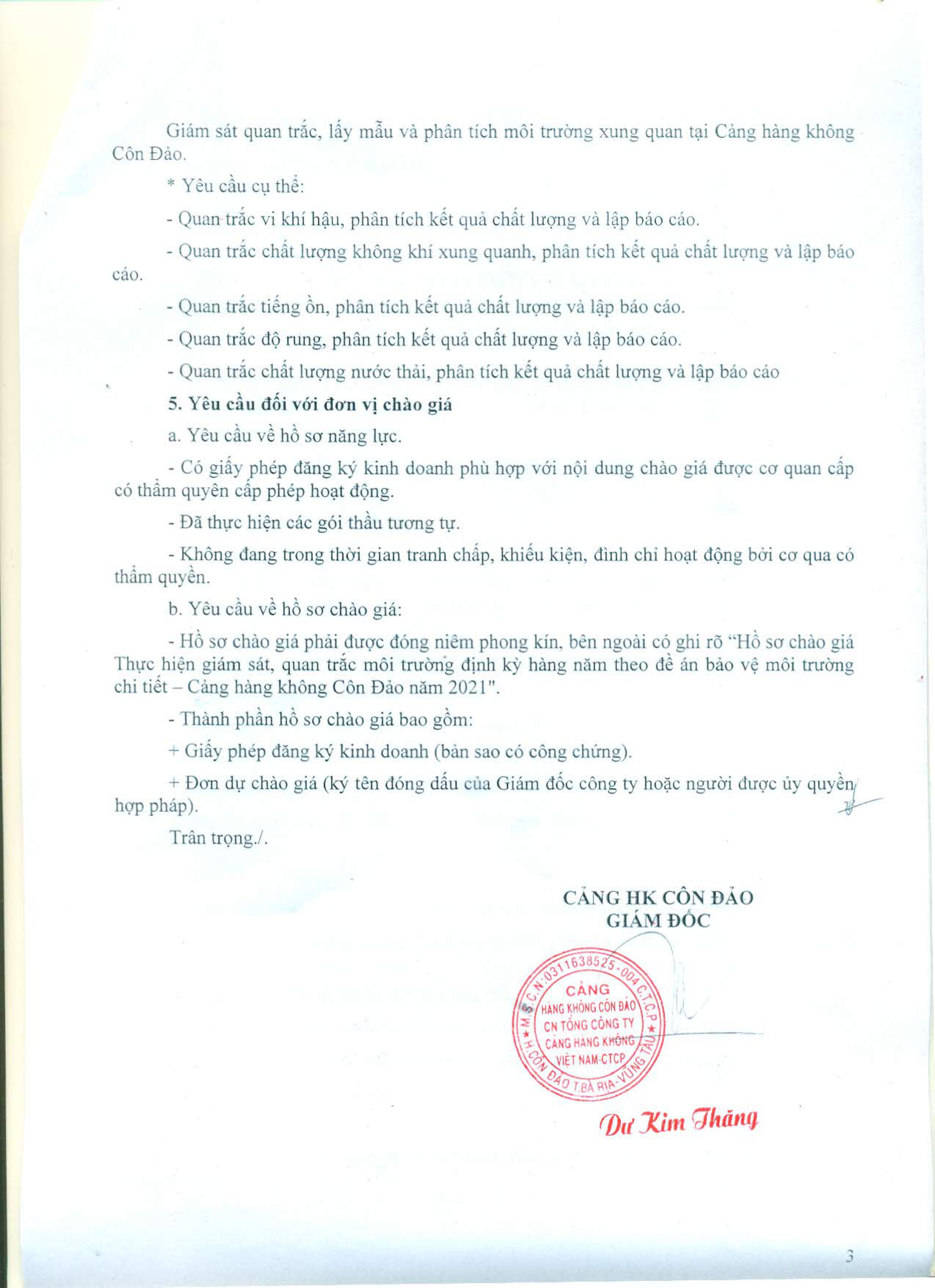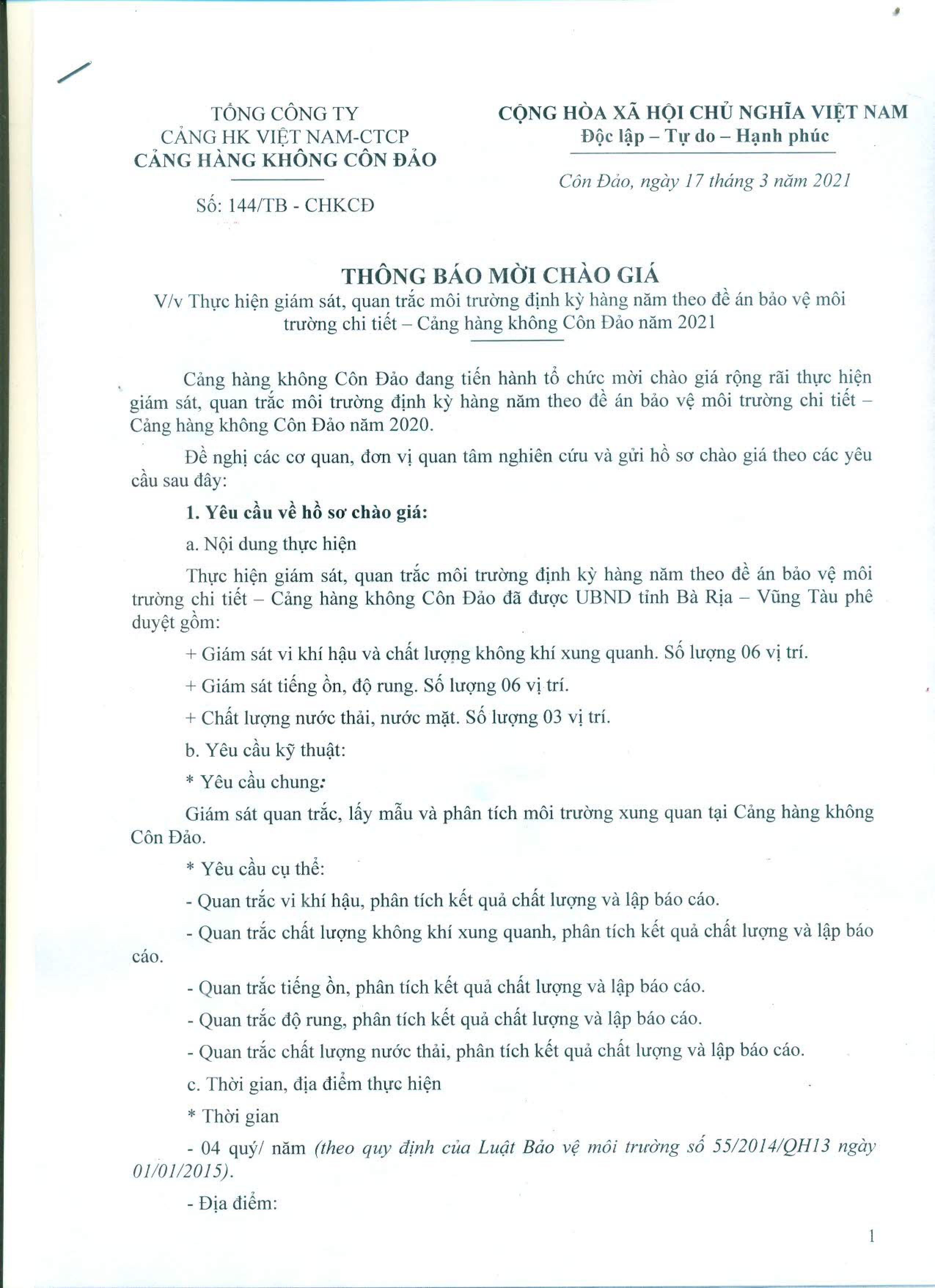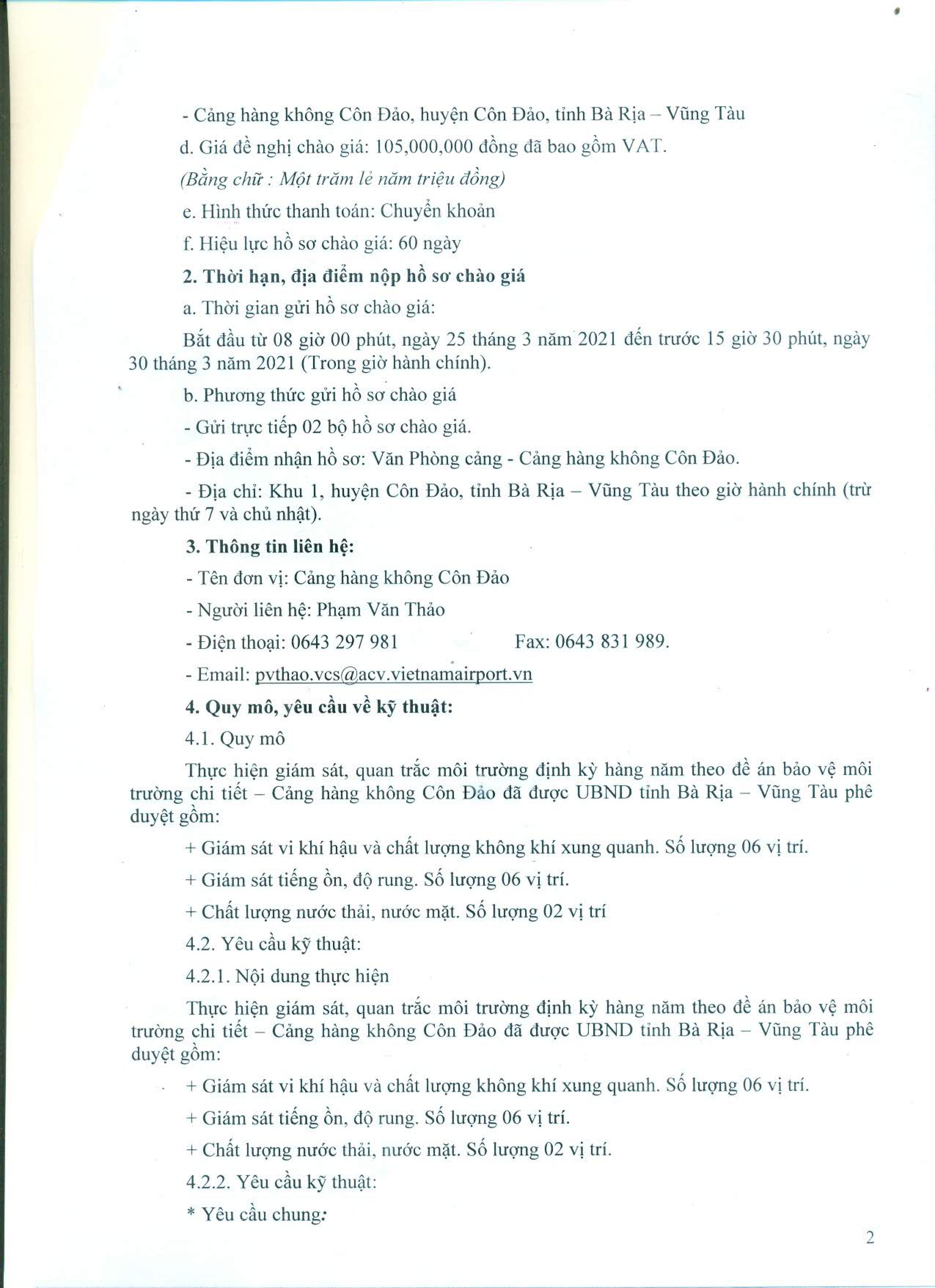 Thông báo mời chào giá về việc thực hiện giám sát, quan tắc môi trường định kỳ hàng năm theo đề án bảo vệ môi trường chi tiết - Cảng Hàng Không Côn Đảo năm 2021