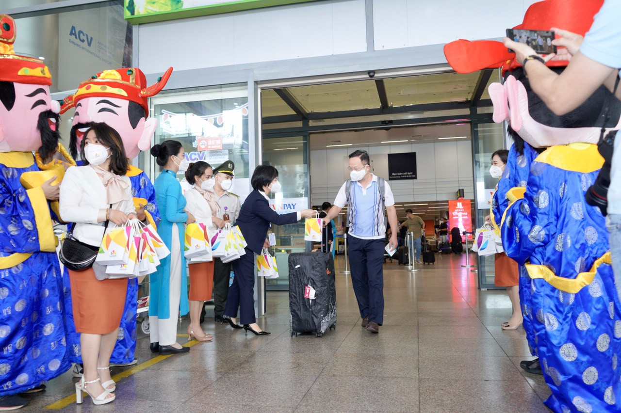 Joining this atmosphere, Danang International Airport has coordinated with Danang Department of Tourism and Vietnam Airlines to hold a ceremony to welcome 184 passengers on flight VN110 to visit the City.