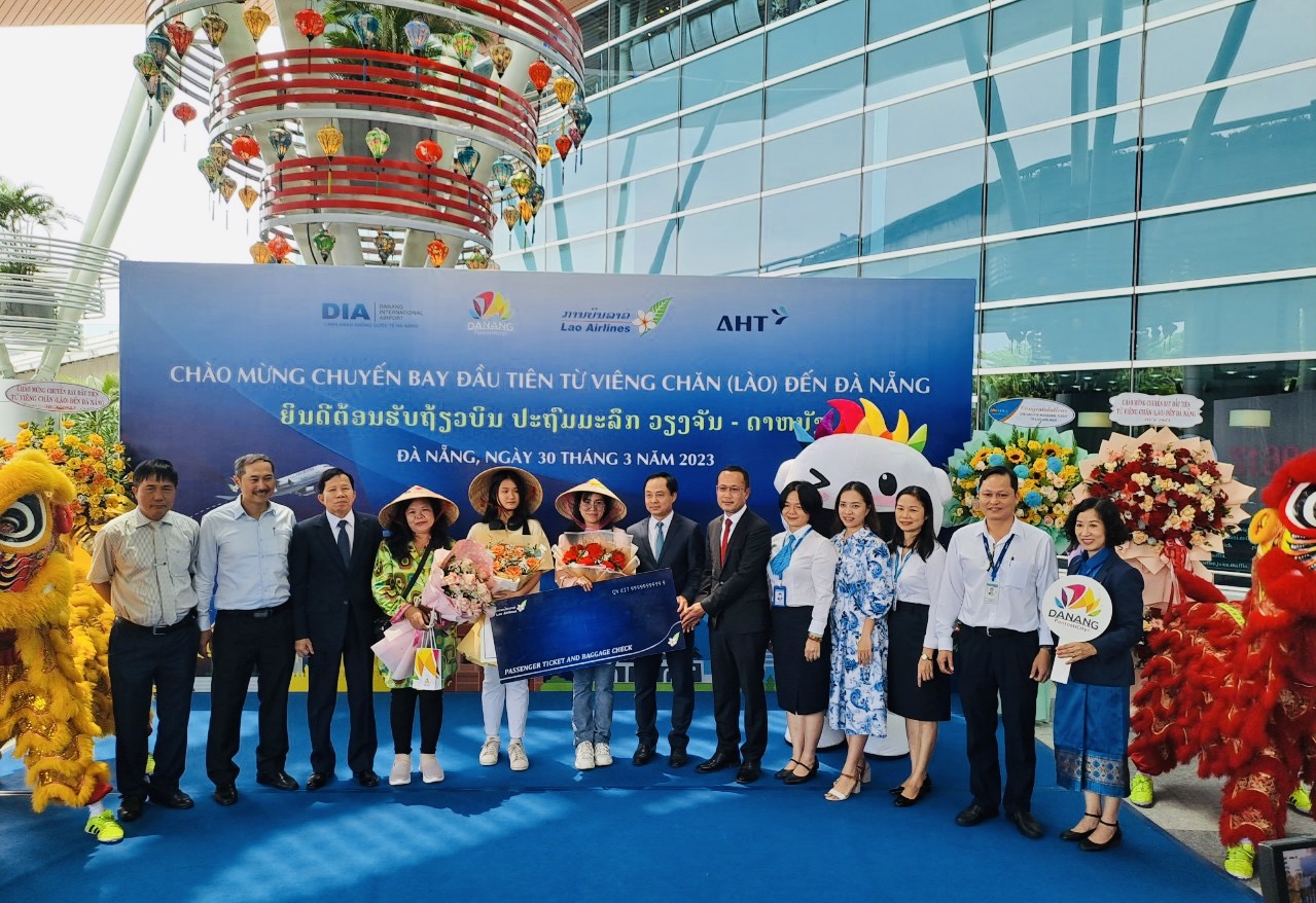 Participating in the welcome ceremony with the participation of: representatives of leaders of Danang Department of Tourism, Middle Airports Authority, Da Nang International Airport, Danang International Terminal Investment and Operation Joint Stock Company (AHT). Da Nang City Tourism Association, Vietnam Airlines, Lao Airlines and media agencies in the city.