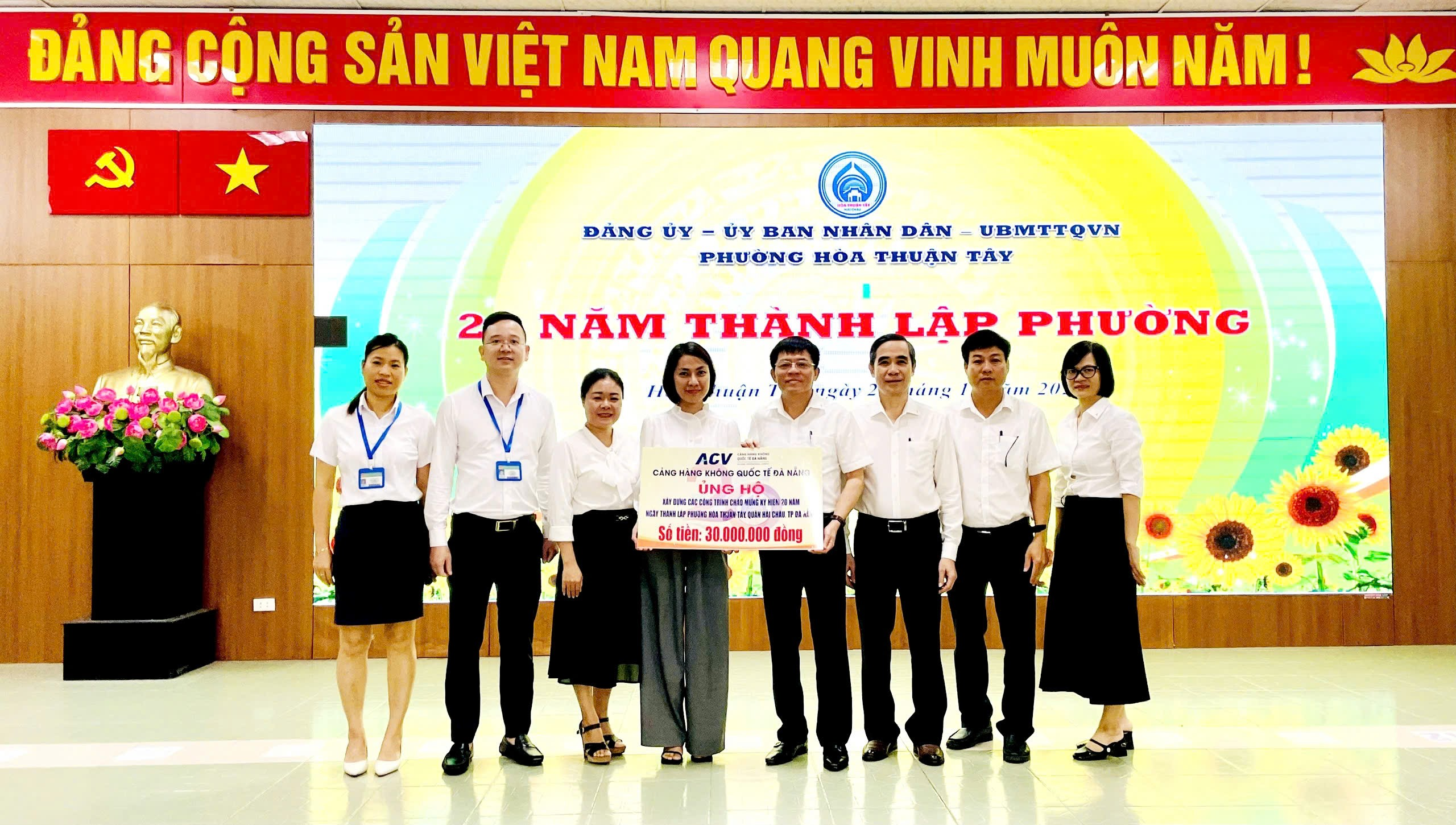 Hưởng ứng thư kêu gọi của Ủy ban mặt trận tổ quốc Việt Nam phường Hòa Thuận Tây về việc chung tay xây dựng công trình chào mừng kỷ niệm 20 năm ngày thành lập phường, sáng ngày 28/10/2024, đoàn cán bộ Cảng hàng không quốc tế Đà Nẵng do ông Tô Ngọc Hải – Phó giám đốc, Chủ tịch công đoàn làm trưởng đoàn đã đến trụ sở phường Hoà Thuận Tây trao ủng hộ 30.000.000đ (Ba mươi triệu đồng chẵn./.) để góp phần chung tay xây dựng công trình chào mừng kỷ niệm 20 năm ngày thành lập phường.