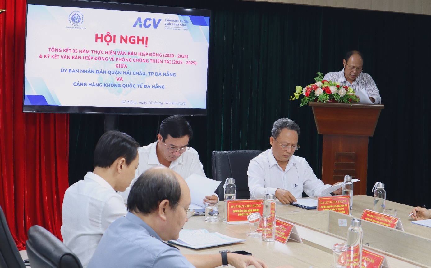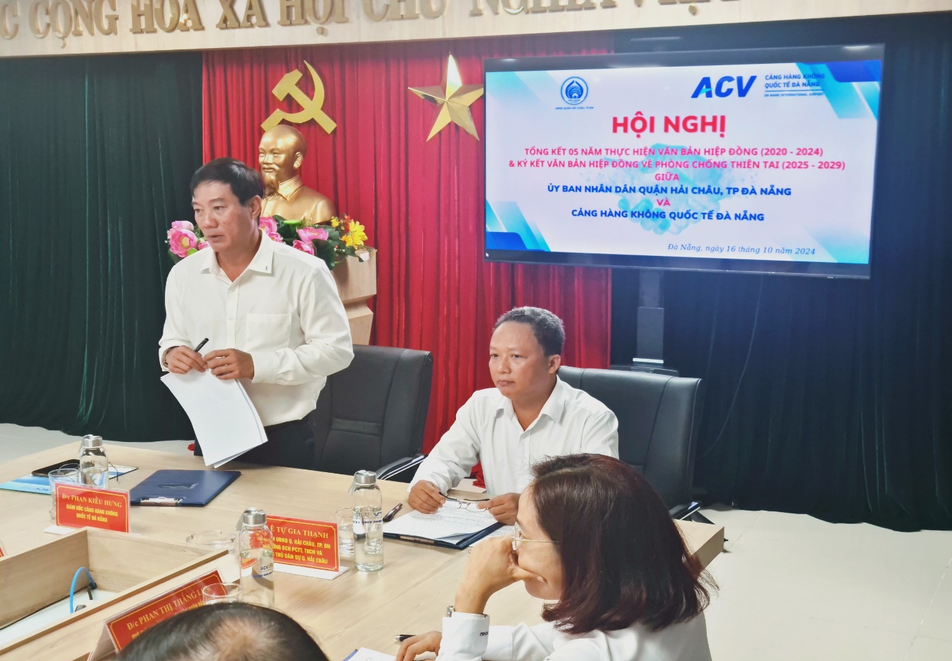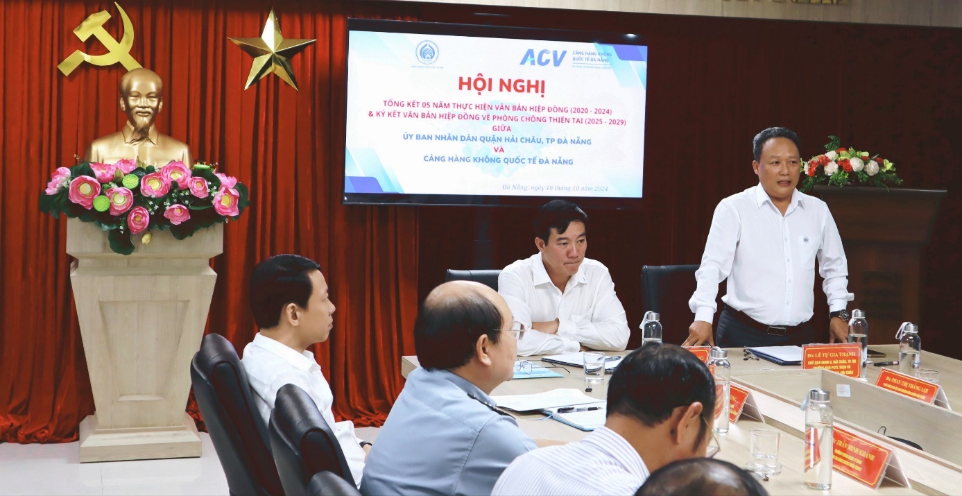 Chiều 16/10/2024, tại Nhà Điều hành Cảng hàng không quốc tế (HKQT) Đà Nẵng, Ủy ban nhân dân (UBND) Quận Hải Châu và Cảng HKQT Đà Nẵng tổ chức Hội nghị tổng kết 5 năm thực hiện Văn bản hiệp đồng (2020 – 2024) và ký kết Văn bản hiệp đồng về Phòng, chống thiên tai (2025 - 2029). Hội nghị đã đánh giá những kết quả đạt được trong giai đoạn 2020-2024, đồng thời đưa ra những phương án hợp tác mới nhằm nâng cao hiệu quả phòng chống thiên tai trong thời gian tới.