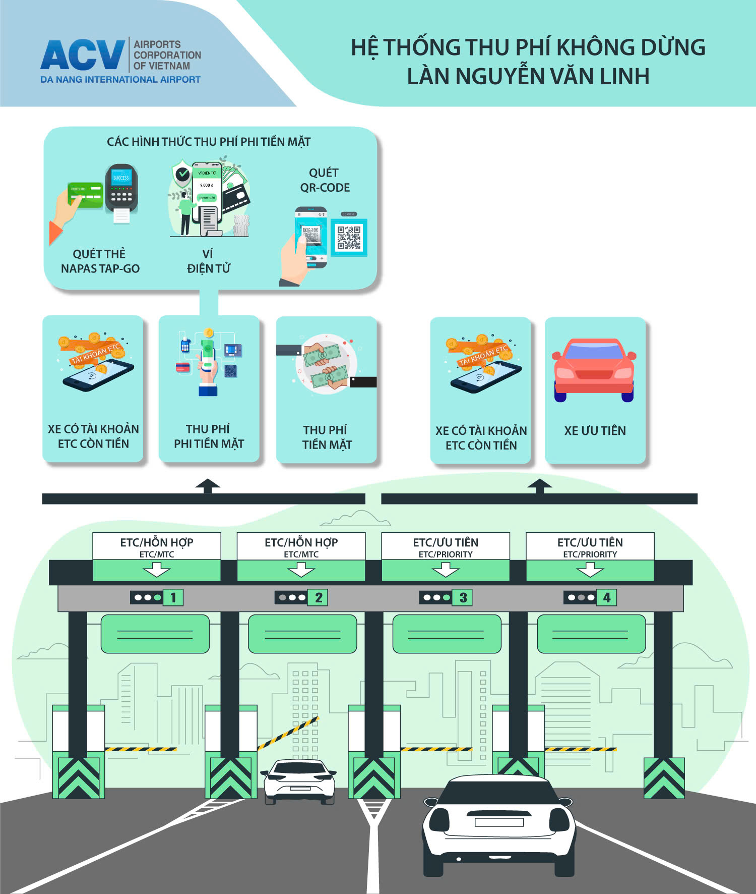 Hiện tại lối ra đường Nguyễn Văn Linh, Cảng bố trí 2 làn hỗn hợp thu ETC/MTC và 2 làn thu ETC/ưu tiên. Tại lối ra đường Duy Tân, Cảng bố trí 2 làn hỗn hợp thu ETC/MTC và 1 làn thu ETC/ưu tiên. Để đảm bảo khai thác tối ưu trạm thu phí, các phương tiện lưu ý đi đúng làn đường khi lưu thông qua các làn ra của Cảng hàng không quốc tế Đà Nẵng. Trường hợp số dư trong tài khoản ETC không đủ để thanh toán hoặc chưa dán thẻ e-Tag ETC thì khách hàng có thể thanh toán bằng tiền mặt, quét mã QR hoặc thanh toán bằng thẻ ngân hàng qua máy POS đặt tại cabin mỗi làn ra.