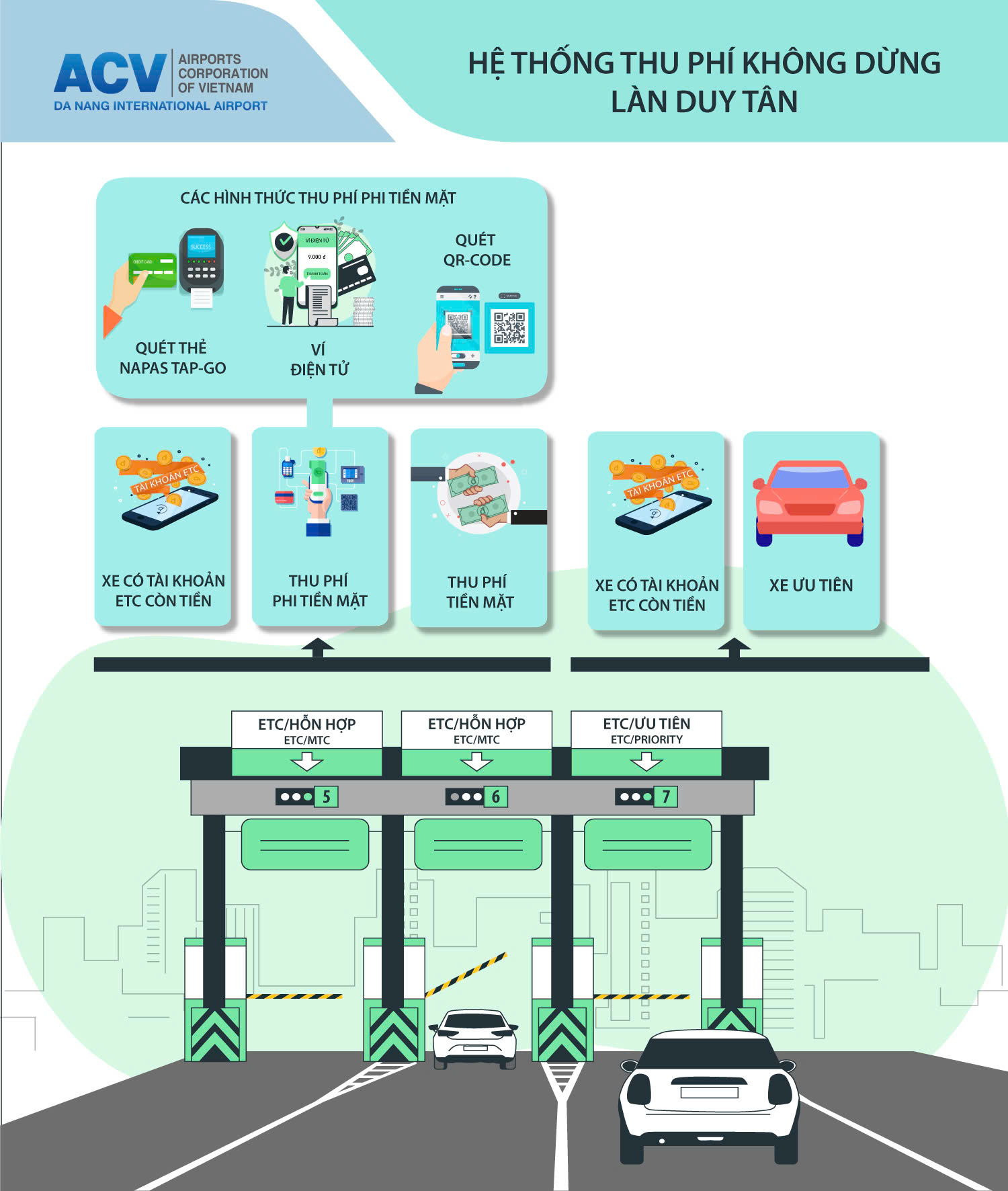 Thực hiện chủ trương của Tổng công ty Cảng hàng không Việt Nam – CTCP, từ ngày 18/7/2024, Cảng hàng không quốc tế Đà Nẵng đã triển khai chuyển đổi hệ thống thu phí 1 dừng (MTC) cũ sang hệ thống thu phí mới có chức năng thu phí không dừng (ETC) và thu không dùng tiền mặt tại toàn bộ các làn ra của sân bay.