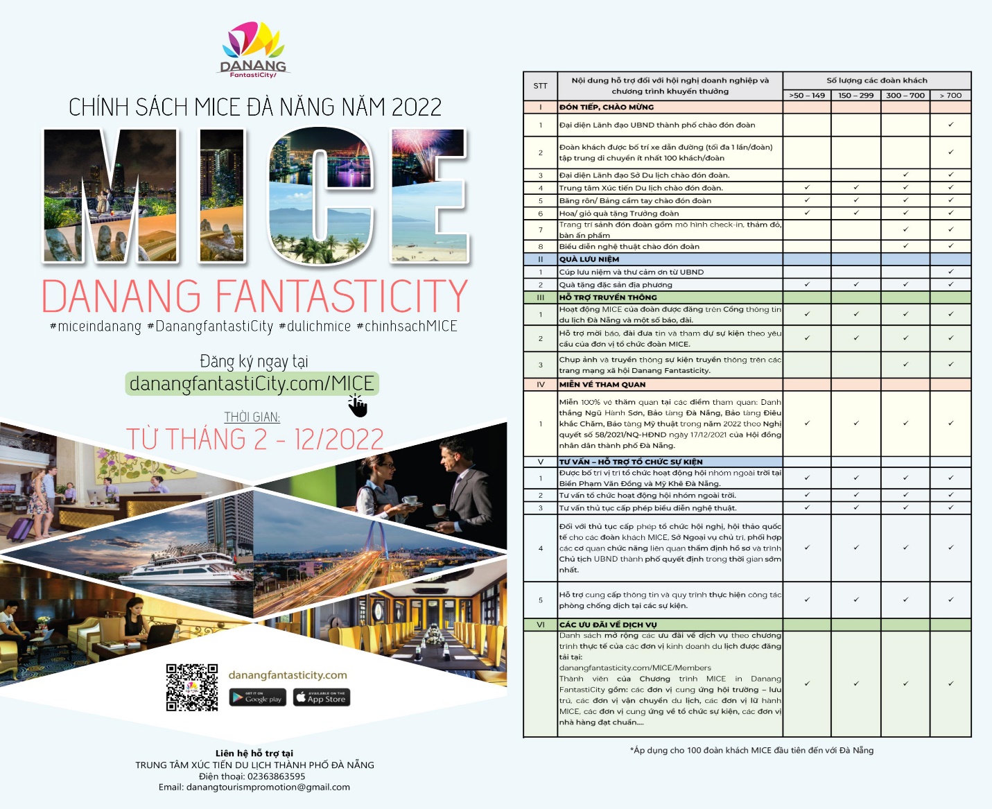 Theo đó, Thành phố tiếp tục áp dụng nhiều chính sách hỗ trợ hấp dẫn, thu hút đoàn khách MICE đến Đà Nẵng trong năm 2022, bao gồm: (1) Hỗ trợ về đón tiếp, chào mừng (2) Hỗ trợ về tặng quà lưu niệm; (3) Hỗ trợ truyền thông; (4) Miễn phí vé tham quan; (5) Tư vấn – hỗ trợ tổ chức sự kiện; (6) Các ưu đãi về dịch vụ.