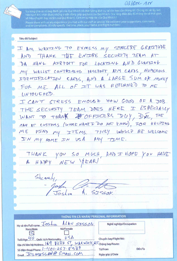 Vào ngày 31/01/2024, Cảng hàng không quốc tế Đà Nẵng nhận được nhiều thư cảm ơn của hành khách về chất lượng dịch vụ, trong đó có thư cảm ơn Lực lượng an ninh hàng không Đà Nẵng đã trách nhiệm, nhiệt tình xác minh và trao trả tài sản thất lạc cho hành khách.