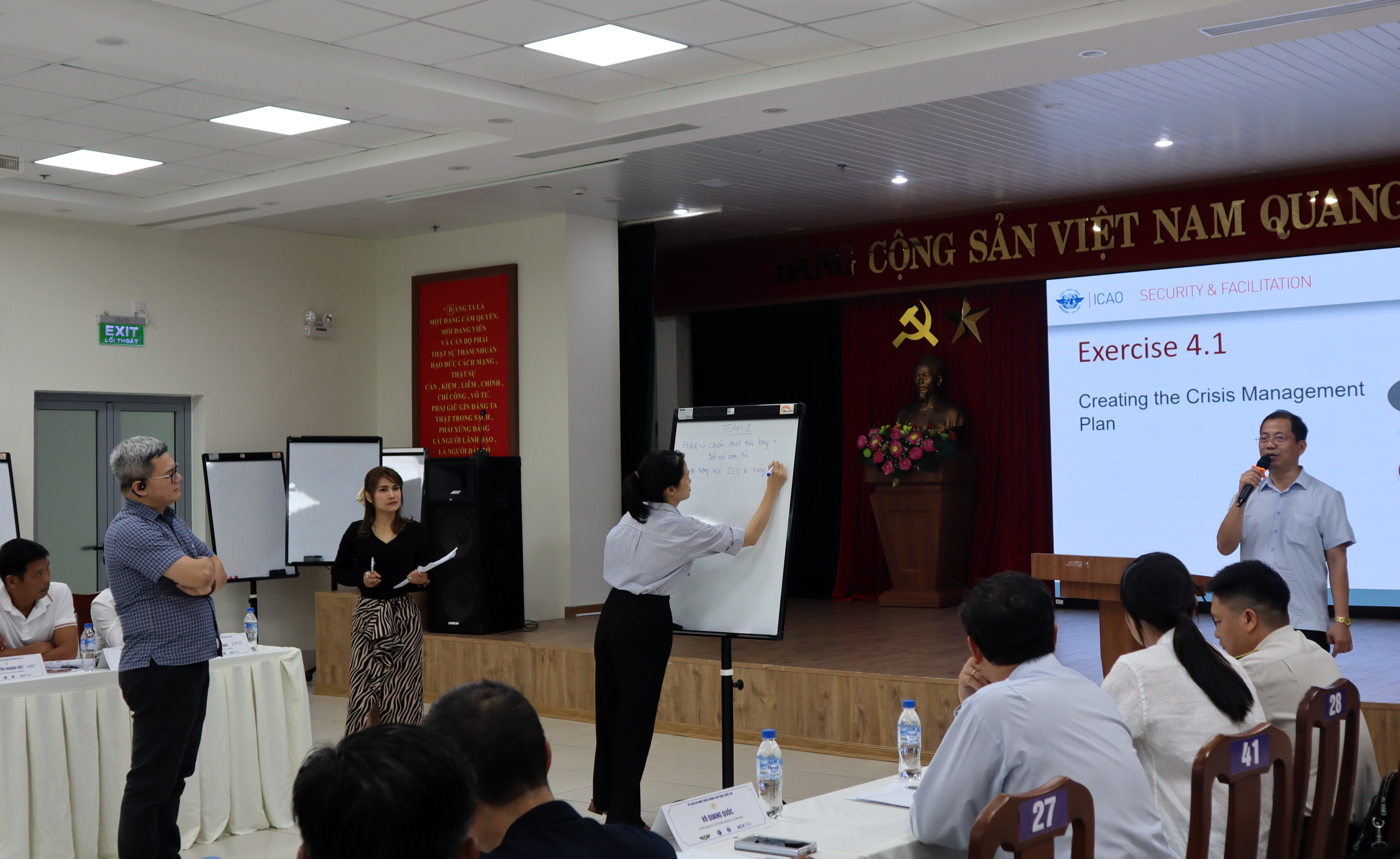 Các học viên thực hành xây dựng các tình huống giả định cho phương án tổng thể đối phó hành vi can thiệp bất hợp pháp vào hoạt động hàng không