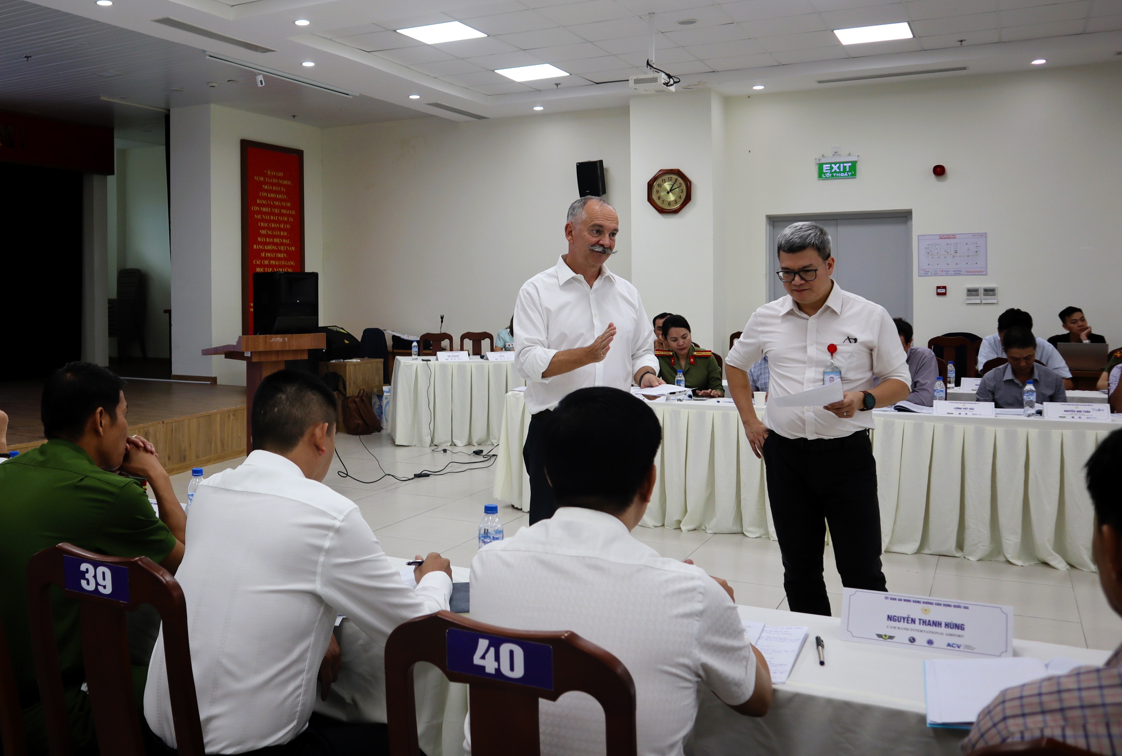 Ông Tony Blackiston - Trưởng đại diện, Cố vấn cấp cao Chương trình Hợp tác ANHK khu vực Châu Á - Thái Bình Dương và ông Tô Tử Hùng - Trưởng phòng An ninh hàng không (Cục HKVN) phân tích về quản lý khủng hoảng, xây dựng kế hoạch nhằm kiểm soát, xử lý và đề ra giải pháp ứng phó phù hợp