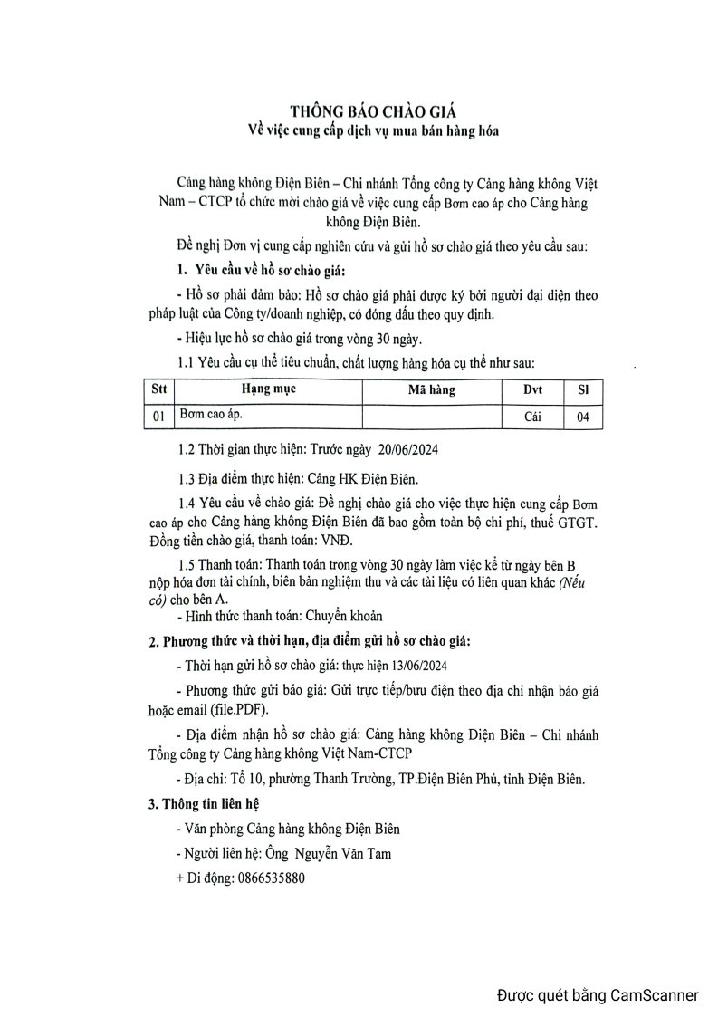 Thông báo chào giá về việc mua sắm Bơm cao áp - Cảng hàng không Điện Biên
