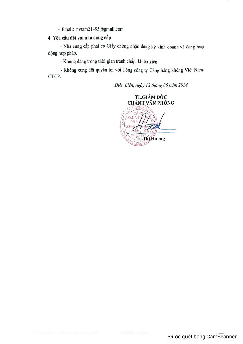 Thông báo chào giá về việc lập hồ sơ báo cáo đề xuất cấp lại giấy phép môi trường cho Cơ sở Cảng hàng không Điện Biên